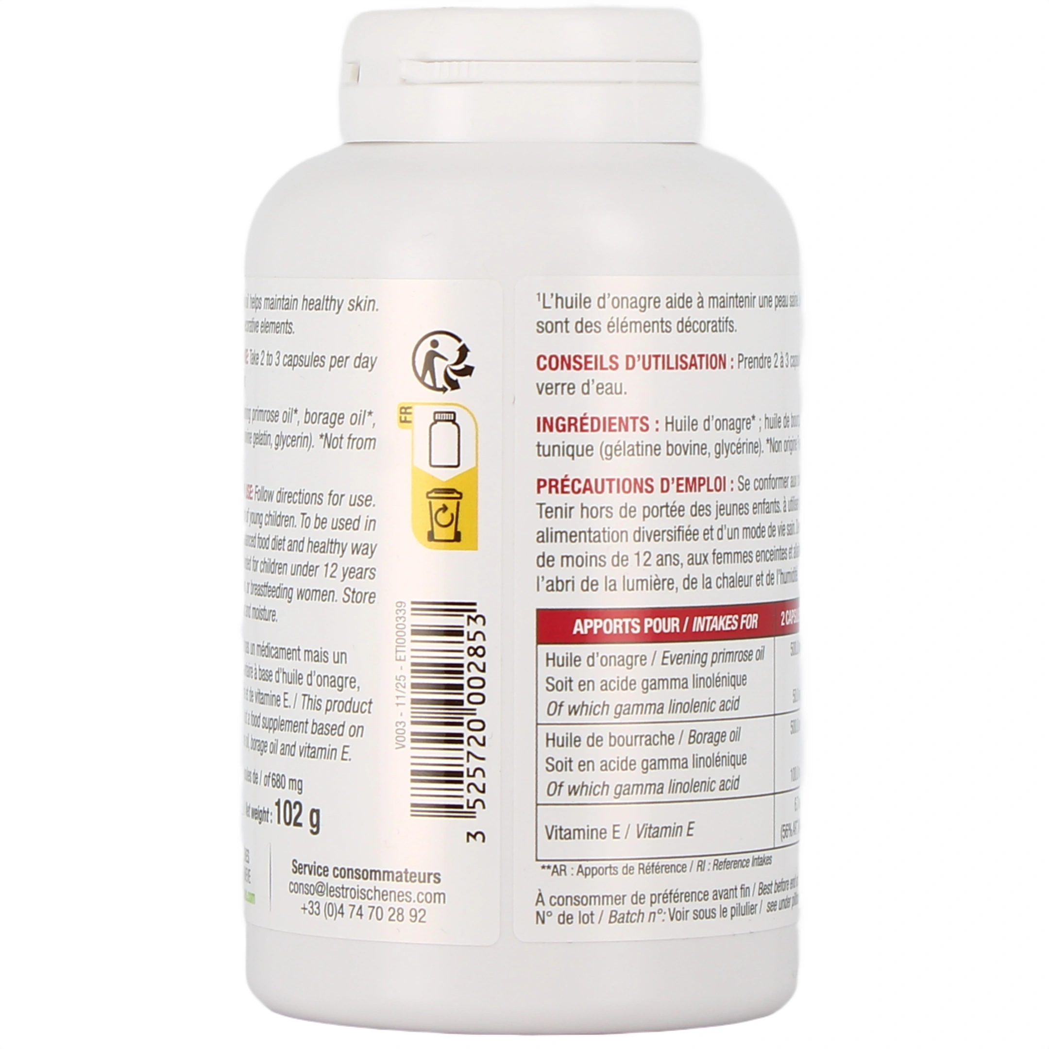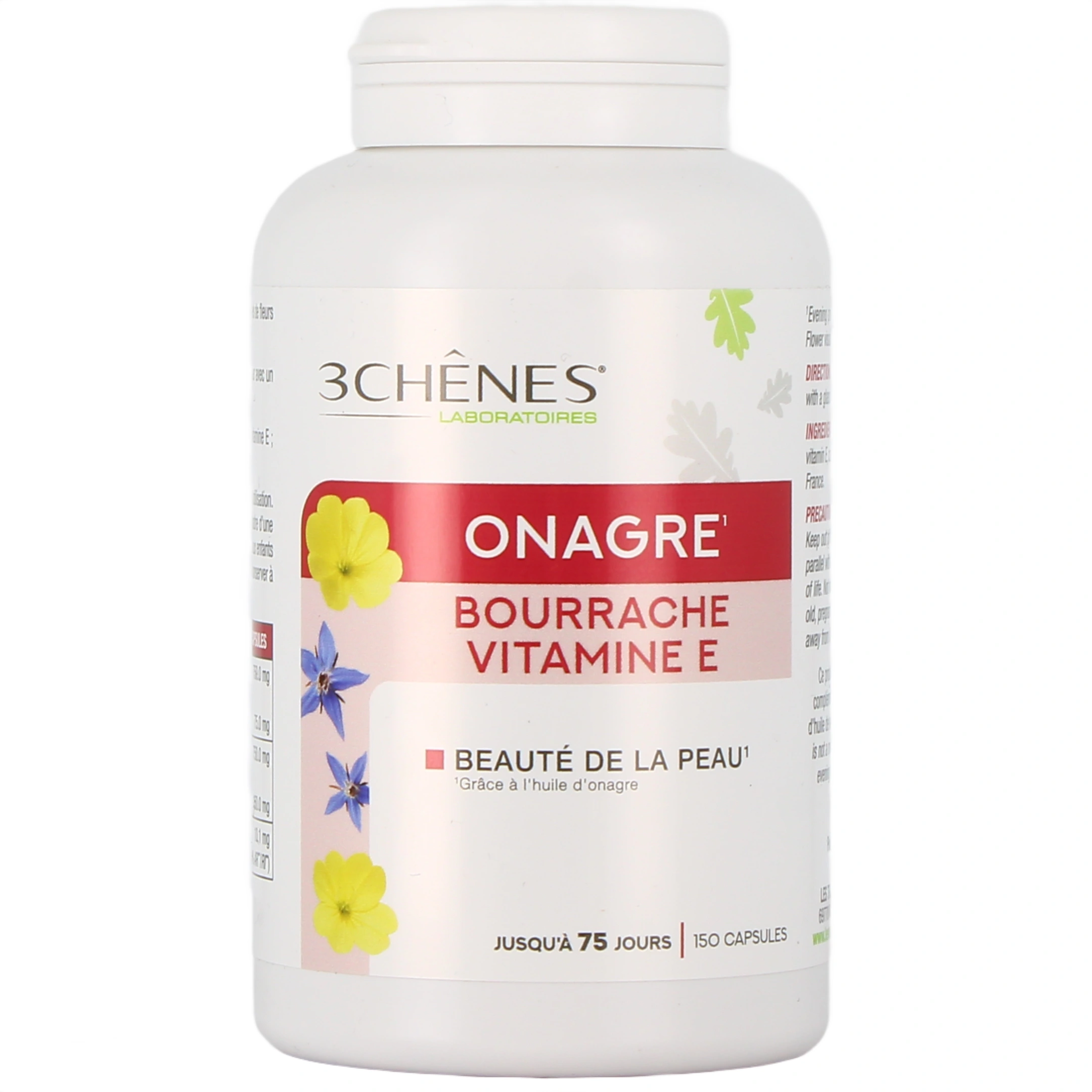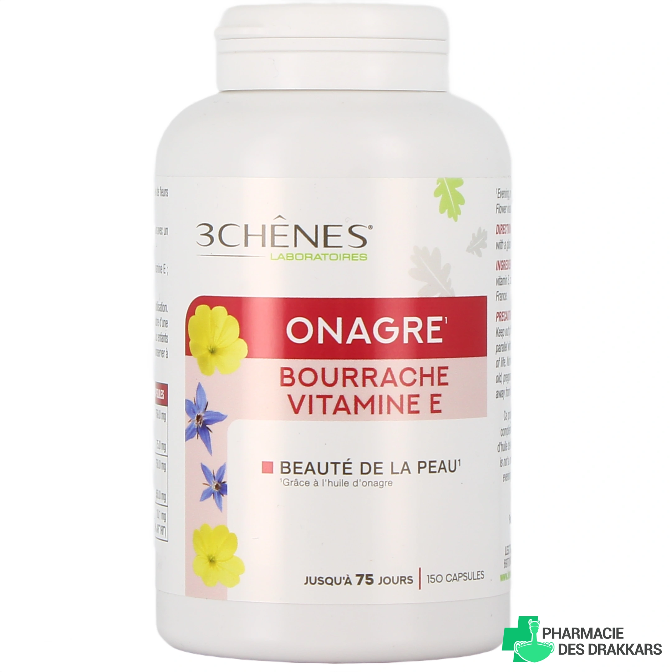 3 Chênes Onagre Bourrache Vitamine E est un complément alimentaire composé d'huiles d'onagre et de bourrache, ainsi que de vitamine E.