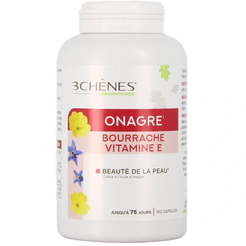 Onagre et Bourrache Vitamine E des laboratoires 3 Chênes est un complément alimentaire qui contribue à la beauté de la peau en maintenant son élasticité.