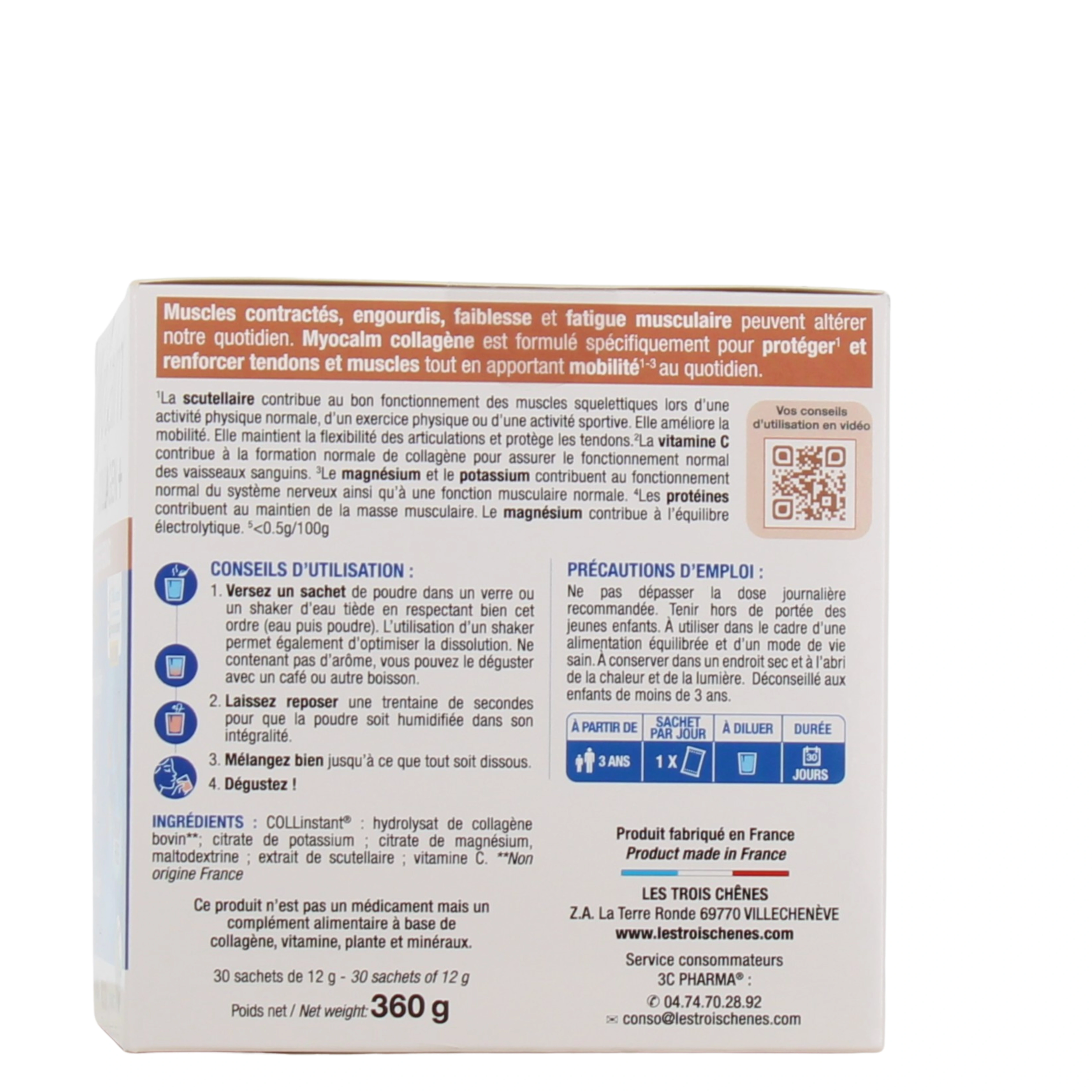 Le complément alimentaire 3C Pharma Myocalm Collagène+ Renfort Musculaire est à retrouver dans les conditionnements suivants chez Pharmacie des Drakkars : pot de 360 g de poudre avec cuillère doseuse ou boîte de 30 sachets goût neutre.