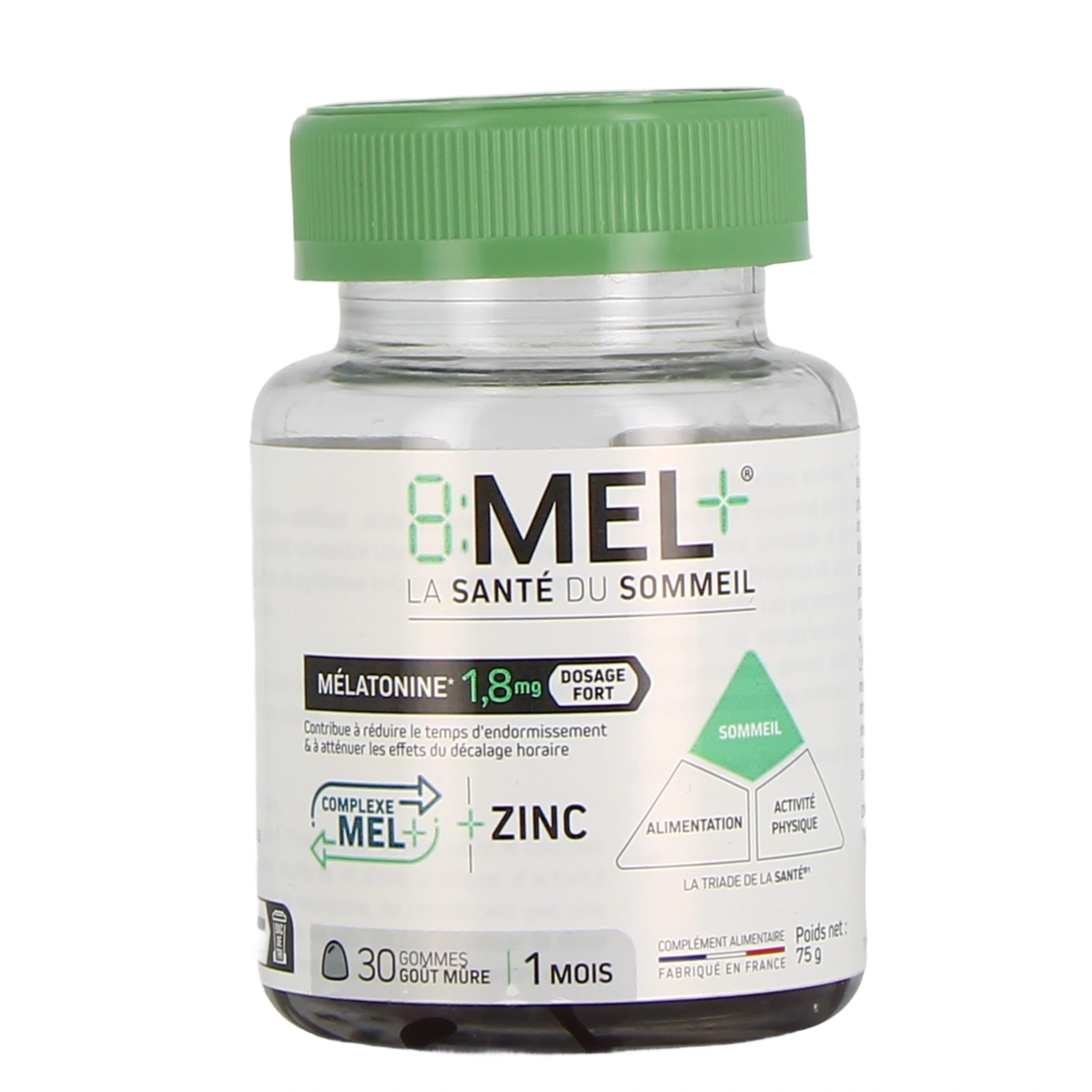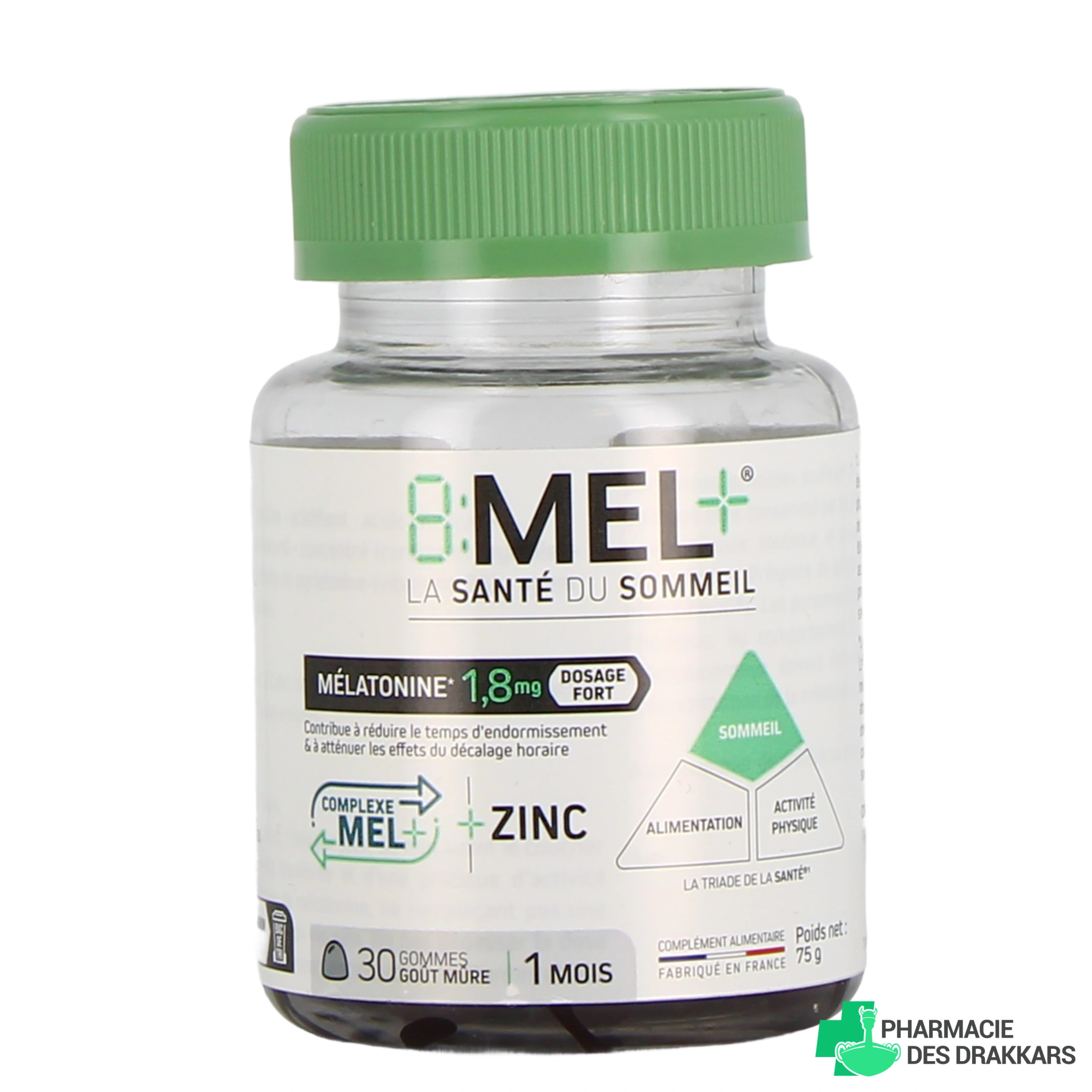Fabriqués en France, les comprimés et gommes de 8Mel+ Mélatonine sont formulés à partir de mélatonine (dosée à 1 mg, 1,8 mg ou 1,9 mg), de magnésium et de zinc. La triade de la santé met en évidence que le sommeil est désormais aussi important que l'alimentation et l'activité physique. C'est à partir des données scientifiques de la triade de la santé que nous avons développé 8Mel+ 1 mg. C'est une formule unique pour le sommeil associant la mélatonine au complexe MEL+ (composé de précurseur de la synthèse de la mélatonine) pour aider à s'endormir plus rapidement, sans risque de dépendance. De plus, le magnésium contribue à réduire la fatigue.