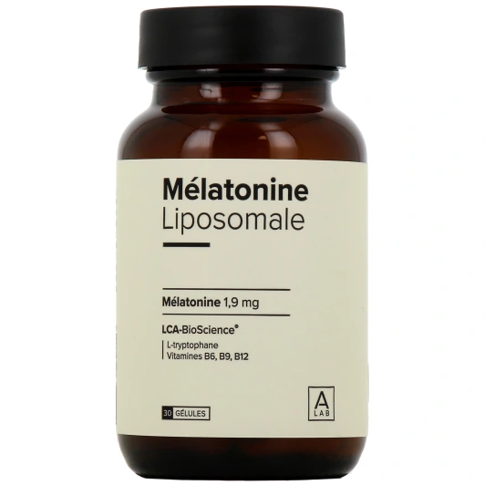 1 gélule de Mélatonine liposomale d'A-Lab vous apporte 1,9 mg de mélatonine, ainsi que 200 mg de L-tryptophane, 0,7 mg de vitamine B6, 0,375 μg de vitamine B12 et 50 μg de vitamine B9. Ce complément alimentaire est fabriqué en France. Il bénéficie d'une protection des actifs par double encapsulation, de la technologie liposomale sans solvant, et possède une formule vegan sans lactose et sans gluten. Les gélules sont fournies dans un flacon en verre brun qui les protège de la lumière et de l'oxydation.