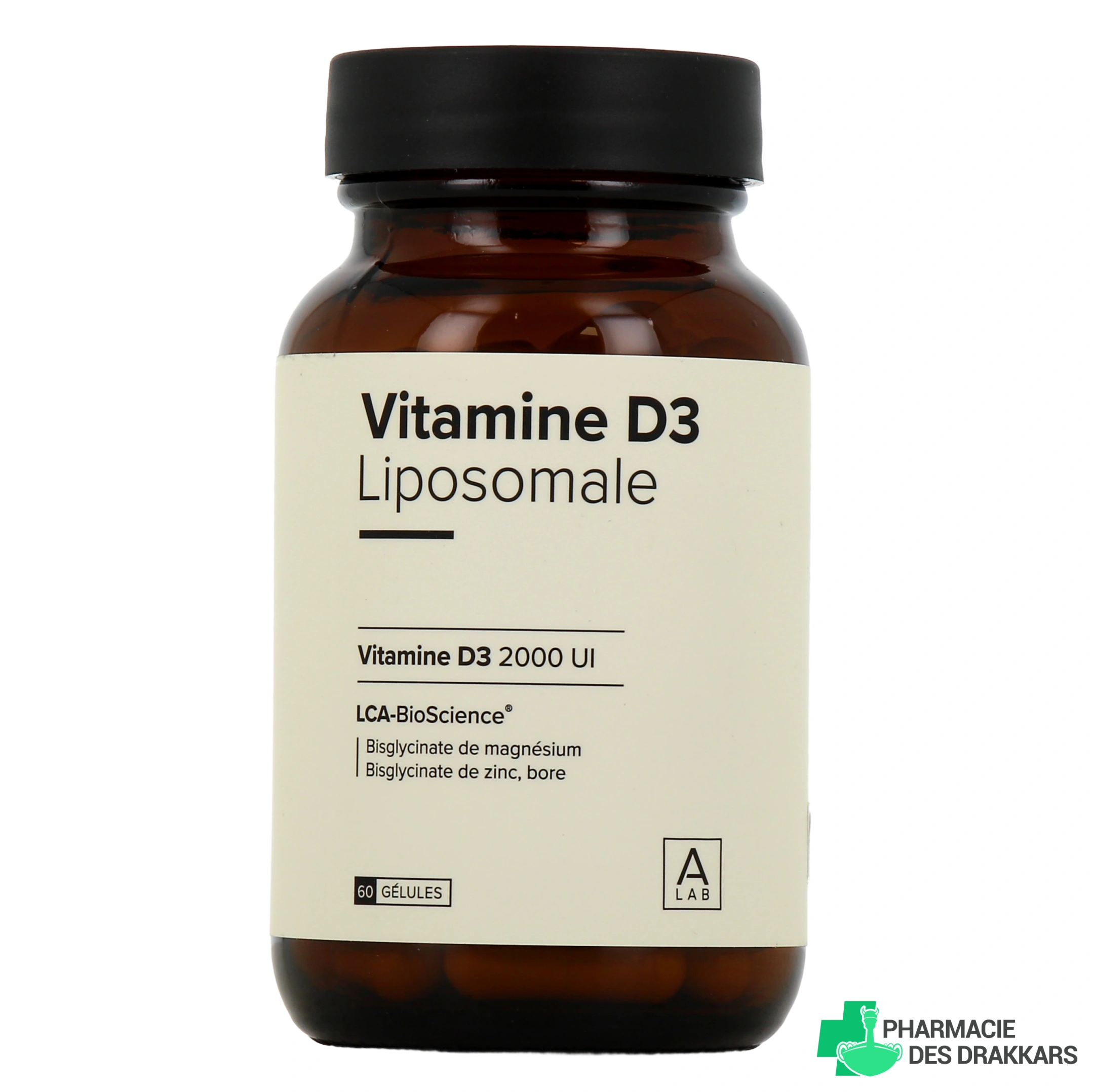 Le complément alimentaire A-LAB Vitamine D3 Liposomale est formulé à partir d'un complexe de vitamine D3 liposomale, dont 2000 UI de vitamine D3 soit 50 μg (ce qui correspond à 1000% des apports de référence journaliers), ainsi que de magnésium, de zinc et de bore (sous forme de bisglycinates), afin de favoriser l'absorption ainsi que l'activation de la vitamine D.