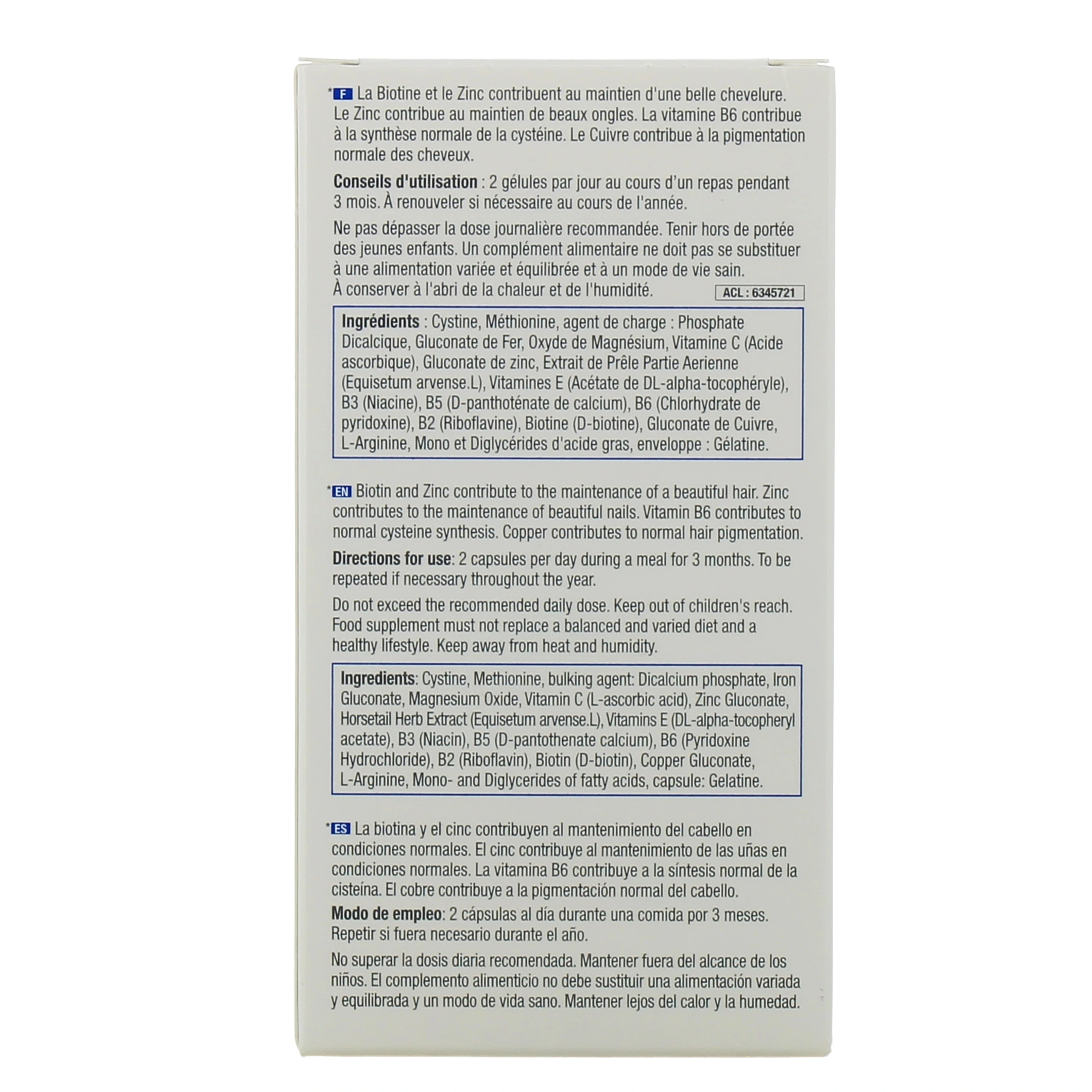 Les gélules ACM Novophane sont formulées pour une action très complète sur le maintien de la santé des cheveux et des ongles. La biotine et le zinc contribuent au maintien d'une belle chevelure. Le zinc contribue également à la beauté des ongles. La vitamine B6 participe à la synthèse de la cystéine. Le cuivre contribue à la pigmentation normale des cheveux.