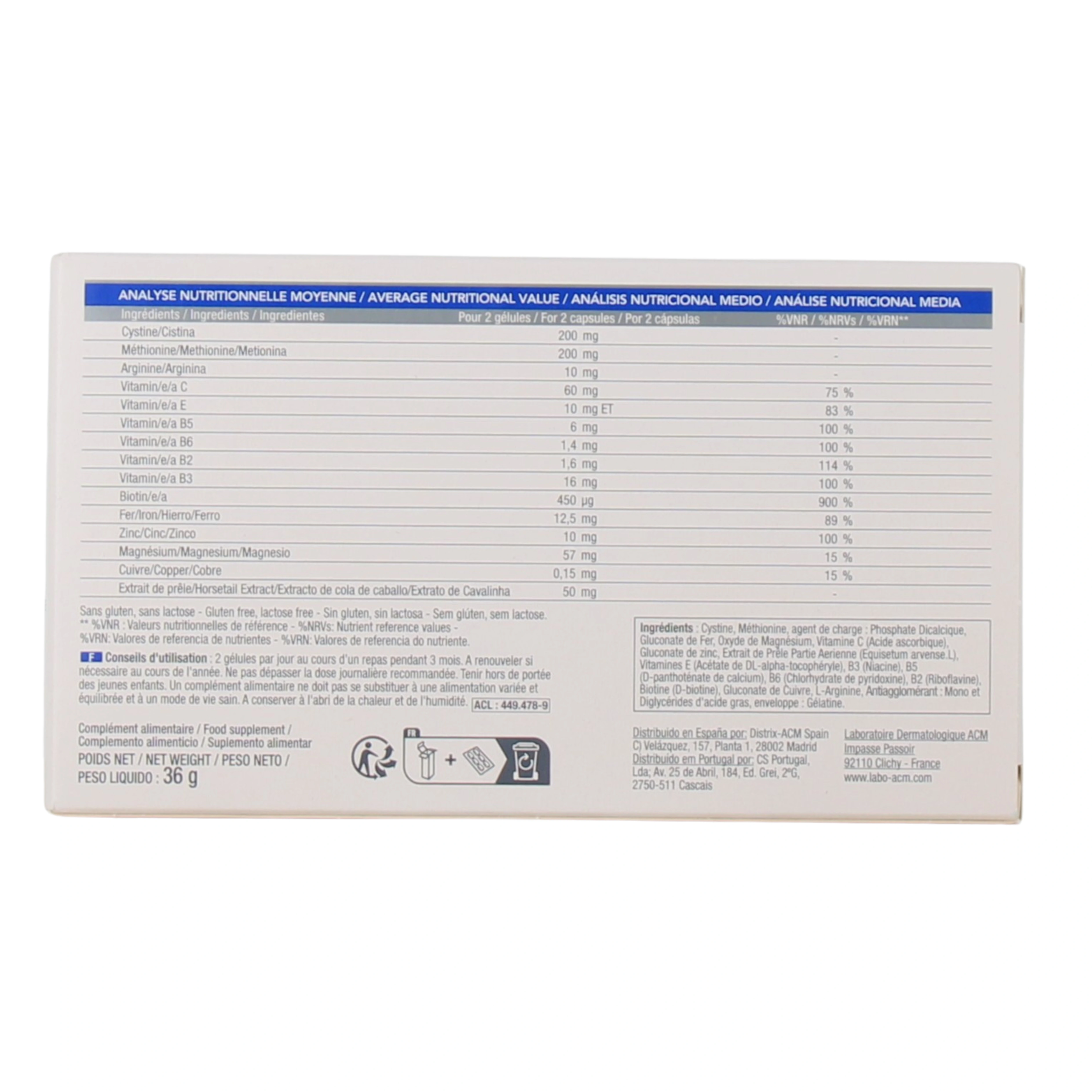 Vos cheveux ont perdu de leur qualité et tombent ? Vos ongles sont mous, fragiles, dédoublés et cassants ? Les gélules Novophane de ACM sont composées d'une formule renforcée à base d'acides aminés, de 7 vitamines et de minéraux, pour une action bénéfique à la fois sur la beauté des ongles et sur la beauté des cheveux.