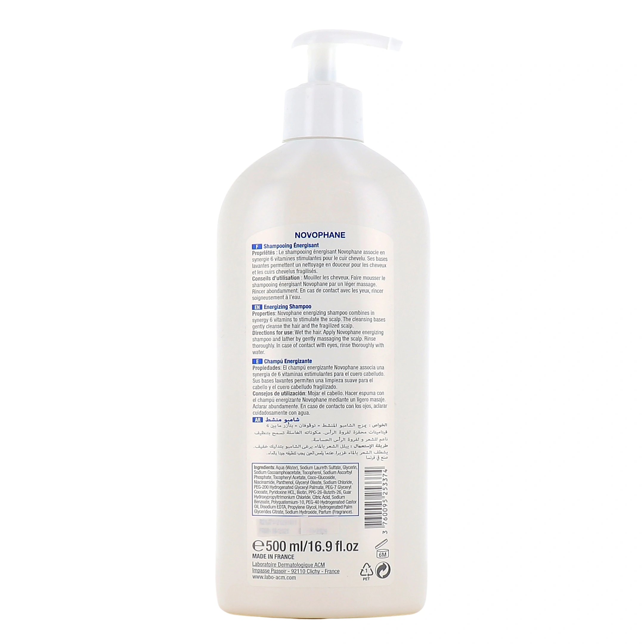 - Flacon pompe de 500ml de shampooing énergisant Novophane ACM.