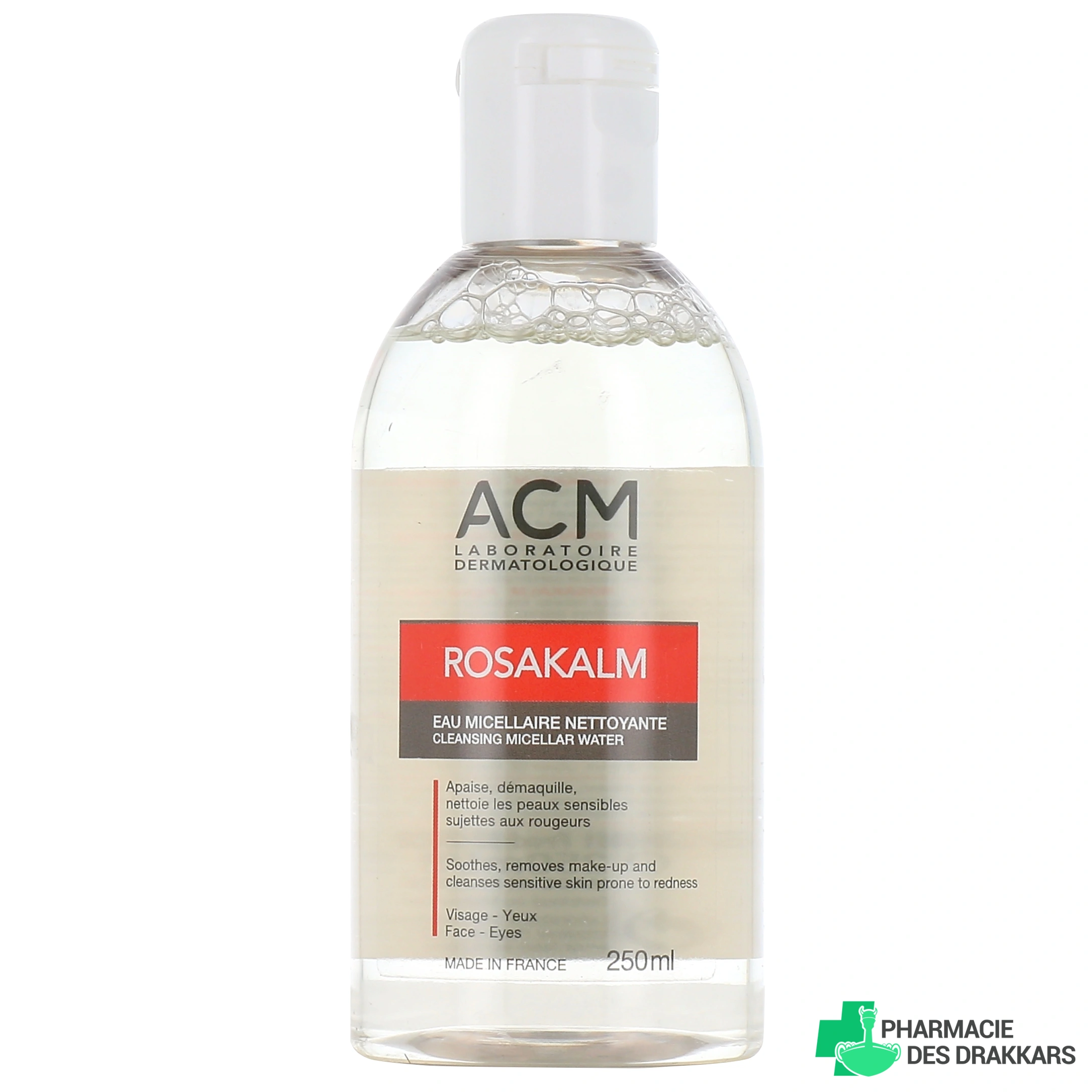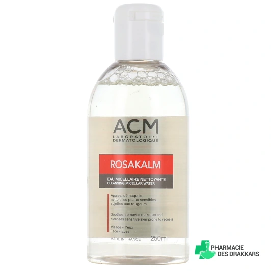 L'eau micellaire nettoyante Rosakalm a été développé par les Laboratoires ACM pour les peaux sensibles et réactives. En un seul geste, elle nettoie et démaquille la peau tout en apaisant visiblement les rougeurs.