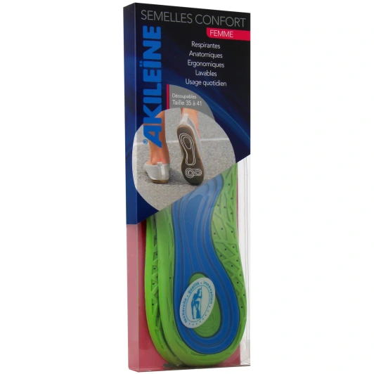 Ces semelles respirantes à forme anatomique soulagent les pieds fatigués et asorbent les chocs lors des activités quotidiennes grâce à la présence de coussinets amortissants. Simples et agréables à utiliser, les semelles de confort Akileïne évacuent la transpiration et les odeurs pour laisser les pieds respirer. Elles s'adaptent facilement à la forme des chaussures afin de réduire les douleurs plantaires et apporter du confort chaque jour.