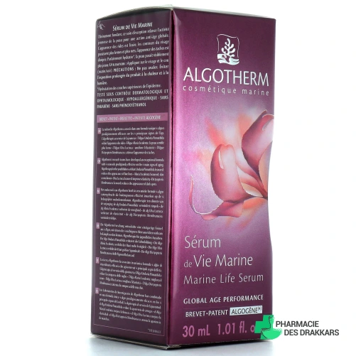 Le Sérum de Vie Marine Algotherm est un soin anti-âge destiné aux peaux matures. Il repose sur une formule unique associant 4 algues et formant ainsi le Brevet Algogène 4 agissant sur les rides, les taches, le manque de fermeté et le relâchement cutané.