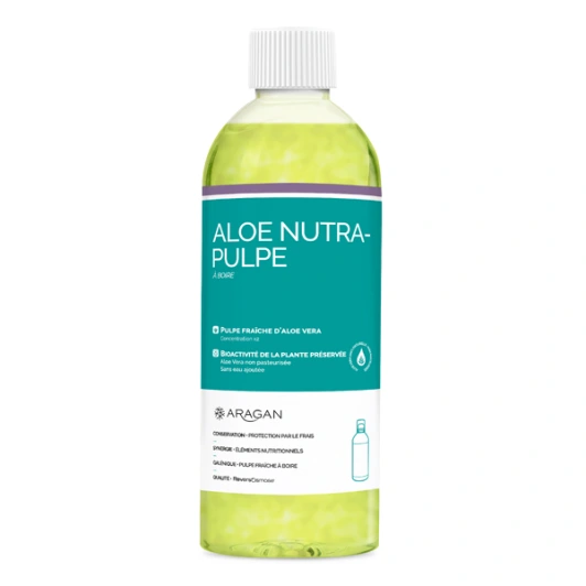 Jus d’aloe vera constitué de plus de 99% de pulpe fraîche d’aloe vera issue de plantations biologiques. Garanti sans eau ajoutée, sans colorants artificiels, sans pasteurisation et sans gluten.