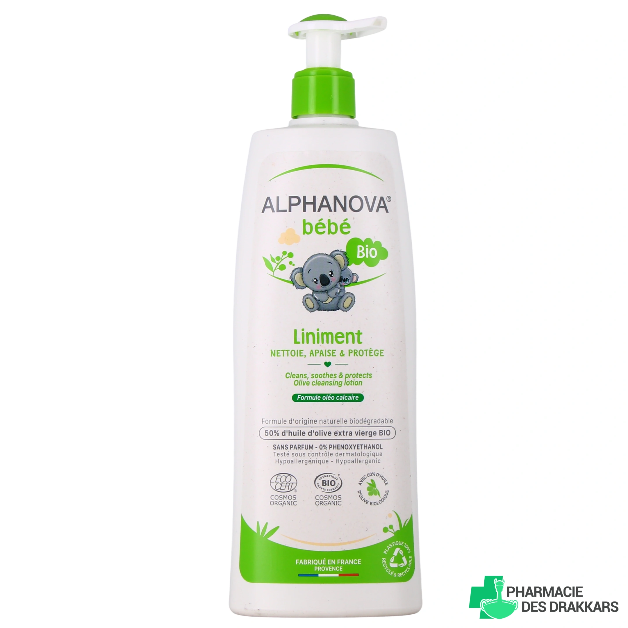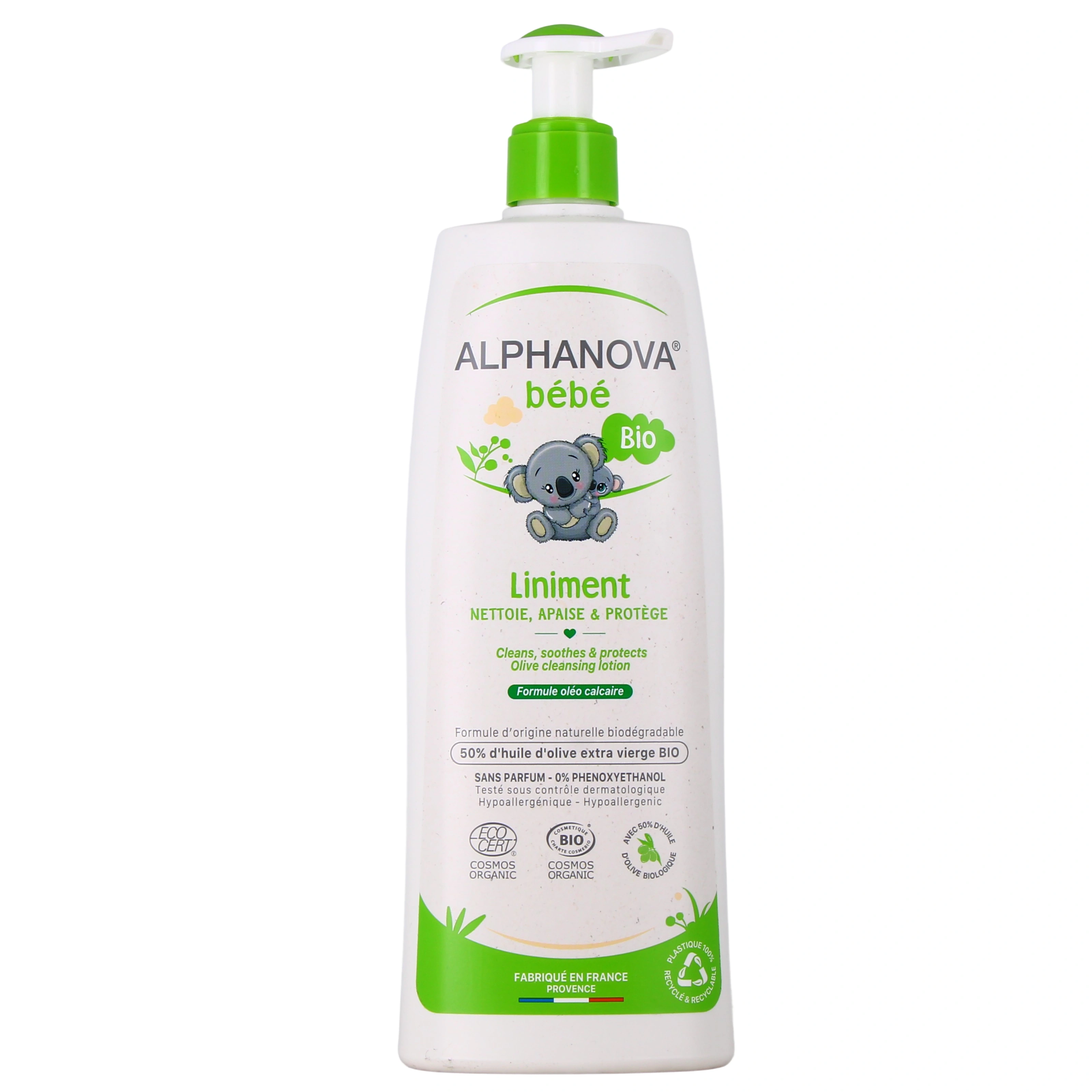 Formulé à base d'une recette traditionnelle provençale, le liniment bio Alphanova contient plus de 50% d’huile d’olive verte biologique, de l'hydroxyde de Calcium et de la cire d'abeille, une composition douce non desséchante pour une utilisation possible lors de chaque change permettant d'isoler la peau de bébé des agressions extérieures (selles, urines, frottements des couches) et ainsi éviter les rougeurs.