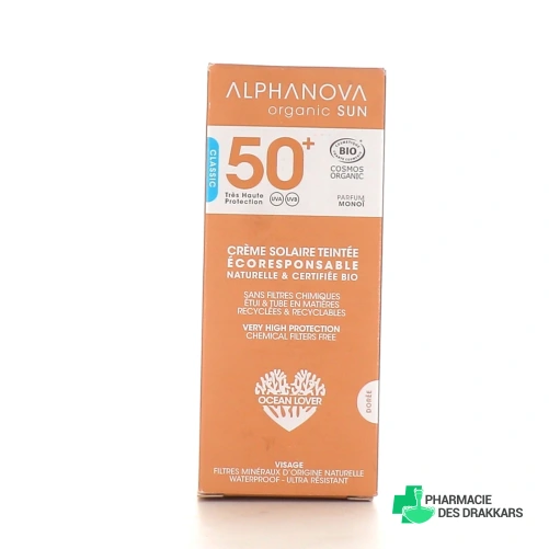 La crème solaire teintée SPF 50+ proposée par la marque Alphanova est une crème solaire bio qui allie protection contre les UV et effet perfecteur de teint. Elle est proposée en teinte dorée et en teinte nude.