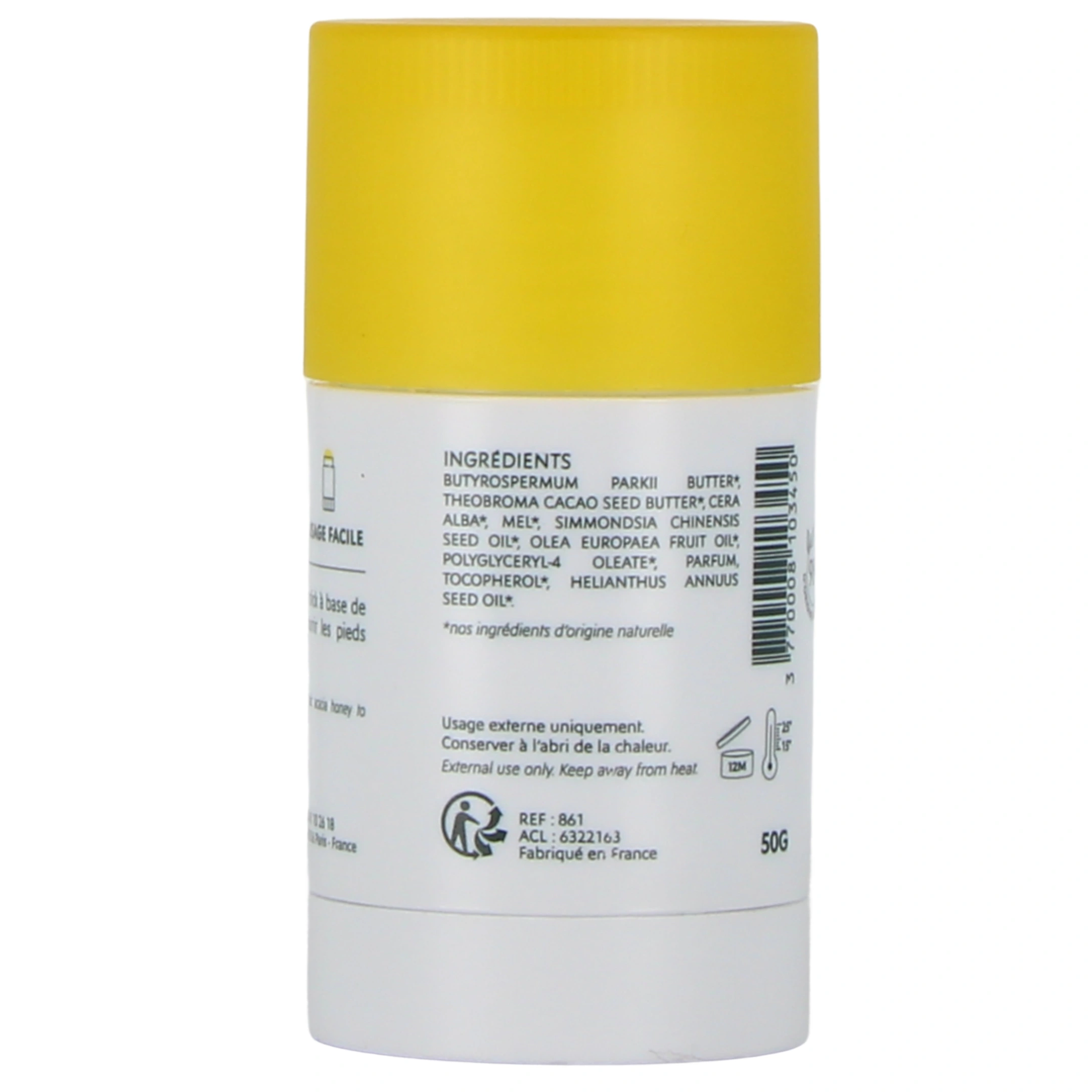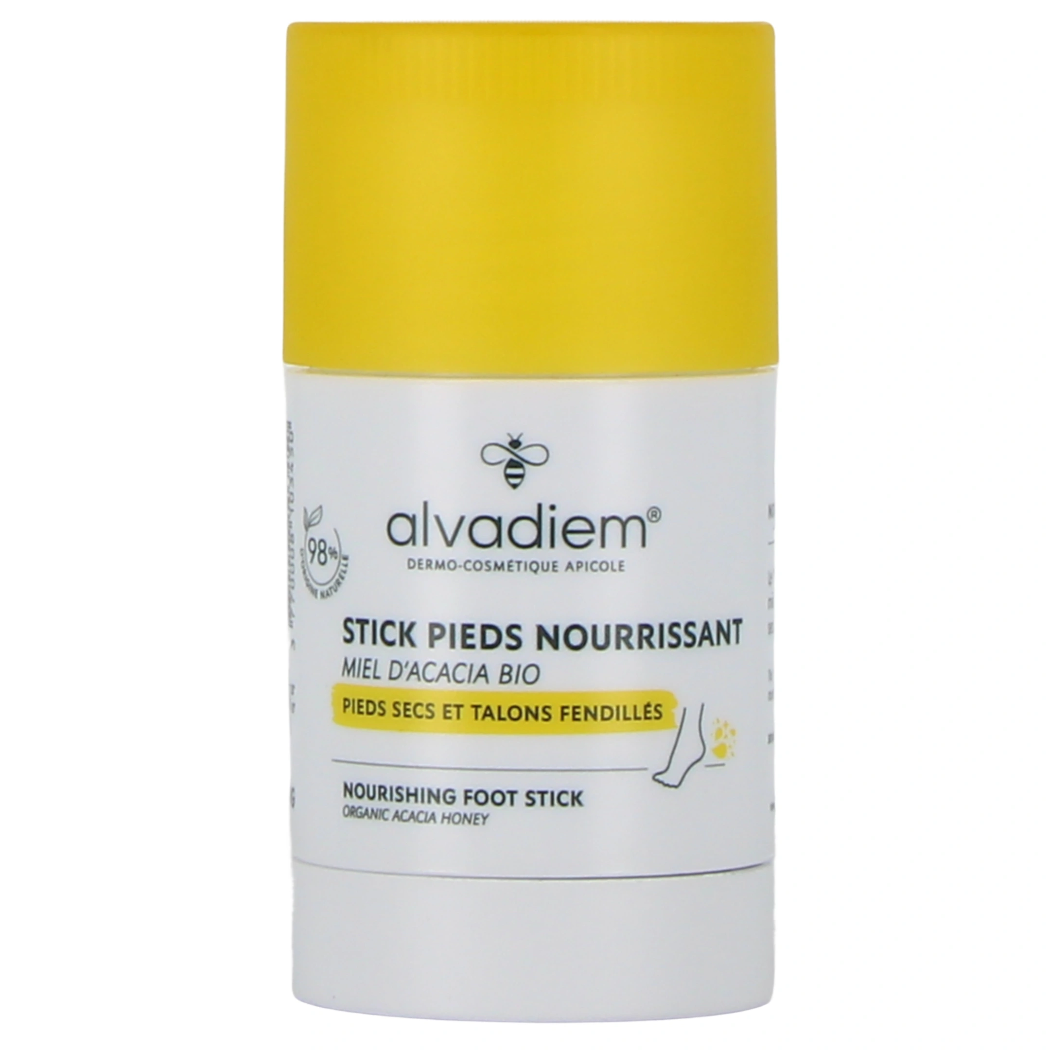 La formule du stick pieds nourrissant Alvadiem est enrichie en miel d'acacia bio, huiles et beurres nourrissants. Le miel favorise le maintien de l'eau au coeur des cellules de la peau et soutient le processus de régénération cutanée. Les beurres de karité et cacao, la cire d'abeille et les huiles végétales de jojoba, d'olive et de tournesol garantissent une nutrition intense et apportent leur fort pouvoir nourrissant, régénérant et protecteur.