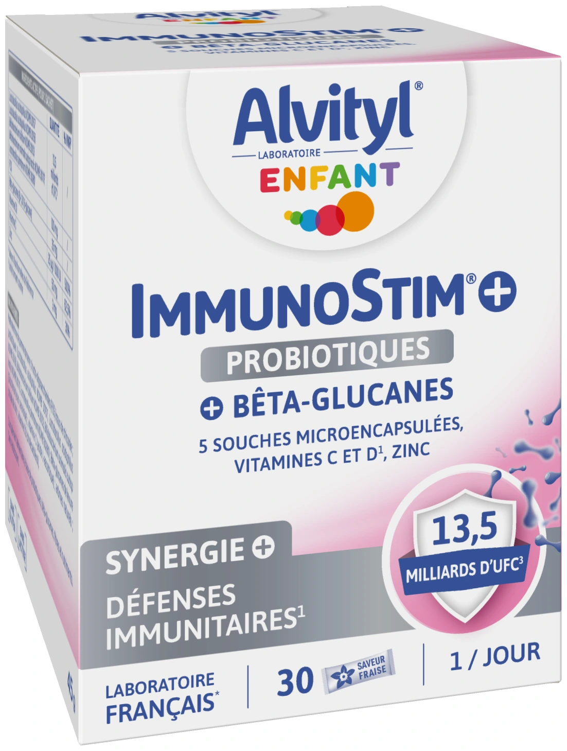 ImmunoStim+ Probiotiques est un complément alimentaire de la marque Alvityl pour les défenses immunitaires. Il contient notamment des bêta-glucanes, des fibres, des vitamines C et D, du zinc et des souches microencapsulées dosées à 13,5 milliards.