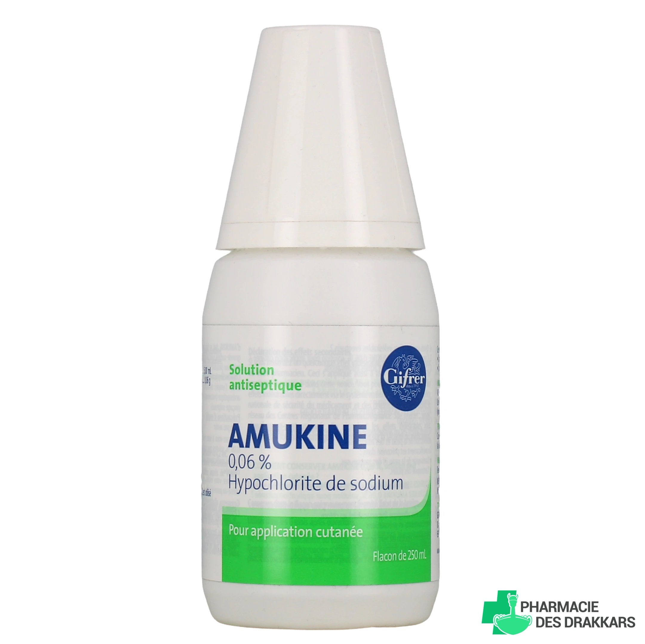 La solution Amukine 0,06% s'utilise pure. Elle contient 5 ml de solution aqueuse d’hypochlorite de sodium pour 100 ml de solution pour application cutanée, soit 0.06 g de chlore actif. Ce médicament appartient à la catégorie des antiseptiques et des désinfectants à large spectre d'activité : bactéricide, fongicide et virucide.