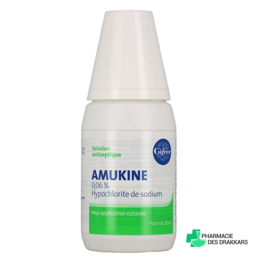 La solution antiseptique Amukine 0,06% est une solution pour application cutanée du laboratoire Gifrer destinée à l'antisepsie de la peau, mais qui peut aussi être utilisée sur les muqueuses et sur les plaies.