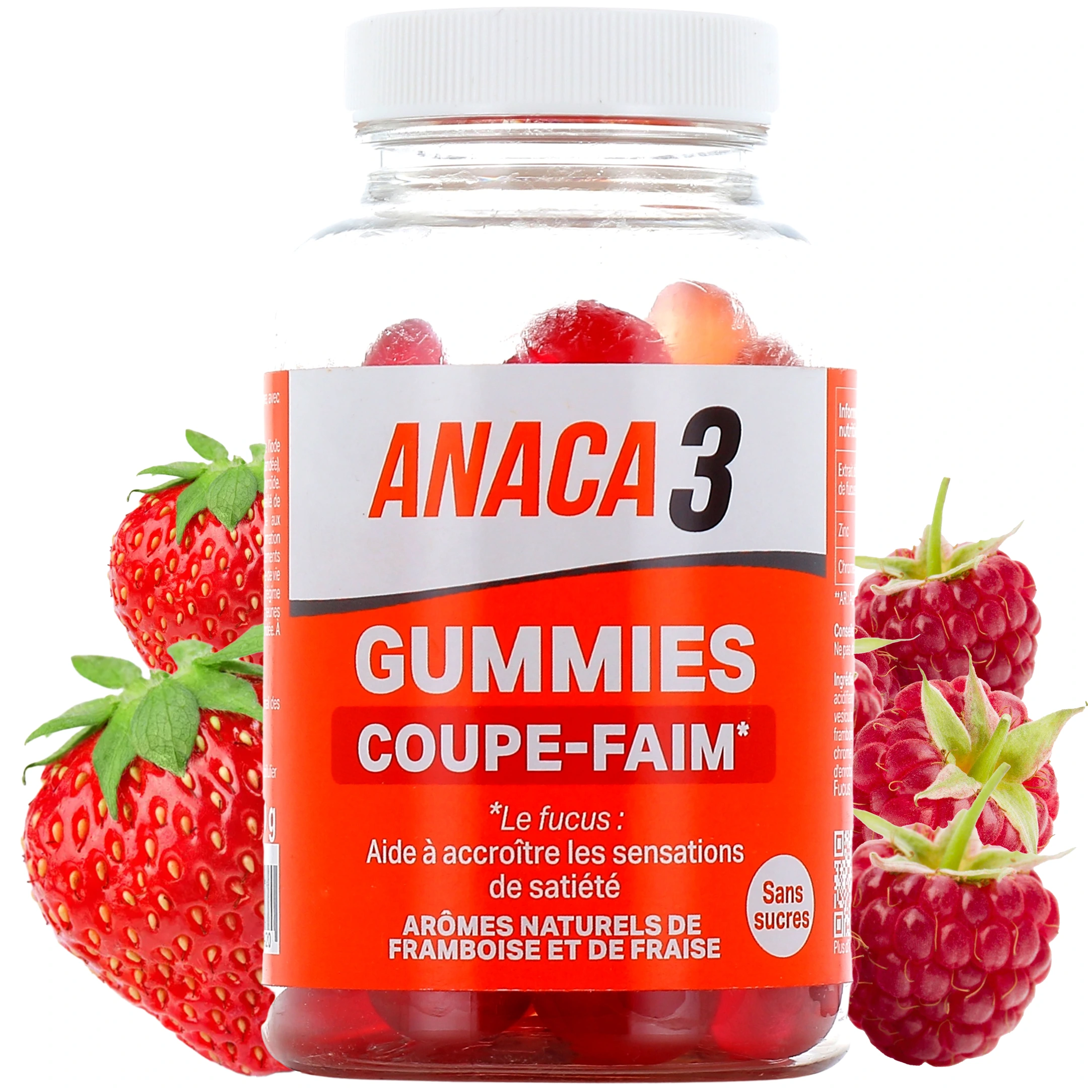 Anaca3 Gummies Coupe-Faim est le premier gummy coupe-faim de la gamme Anaca3, à l'arôme naturel de framboise ou de fraise. Les gummies Anaca3 Coupe-Faim sont formulés à partir de fucus, de chrome et de zinc :