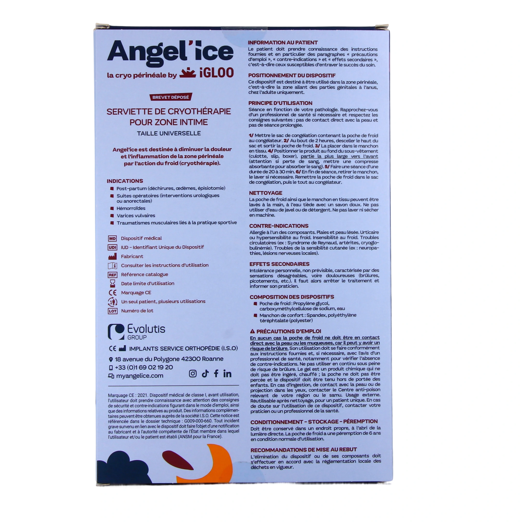 Angel Ice est une serviette de cryothérapie pour zone périnéale. Ce dispositif médical prend la forme d'une poche de froid adaptée à la région du périnée pour atténuer la douleur et l'inflammation, en particulier après l'accouchement.