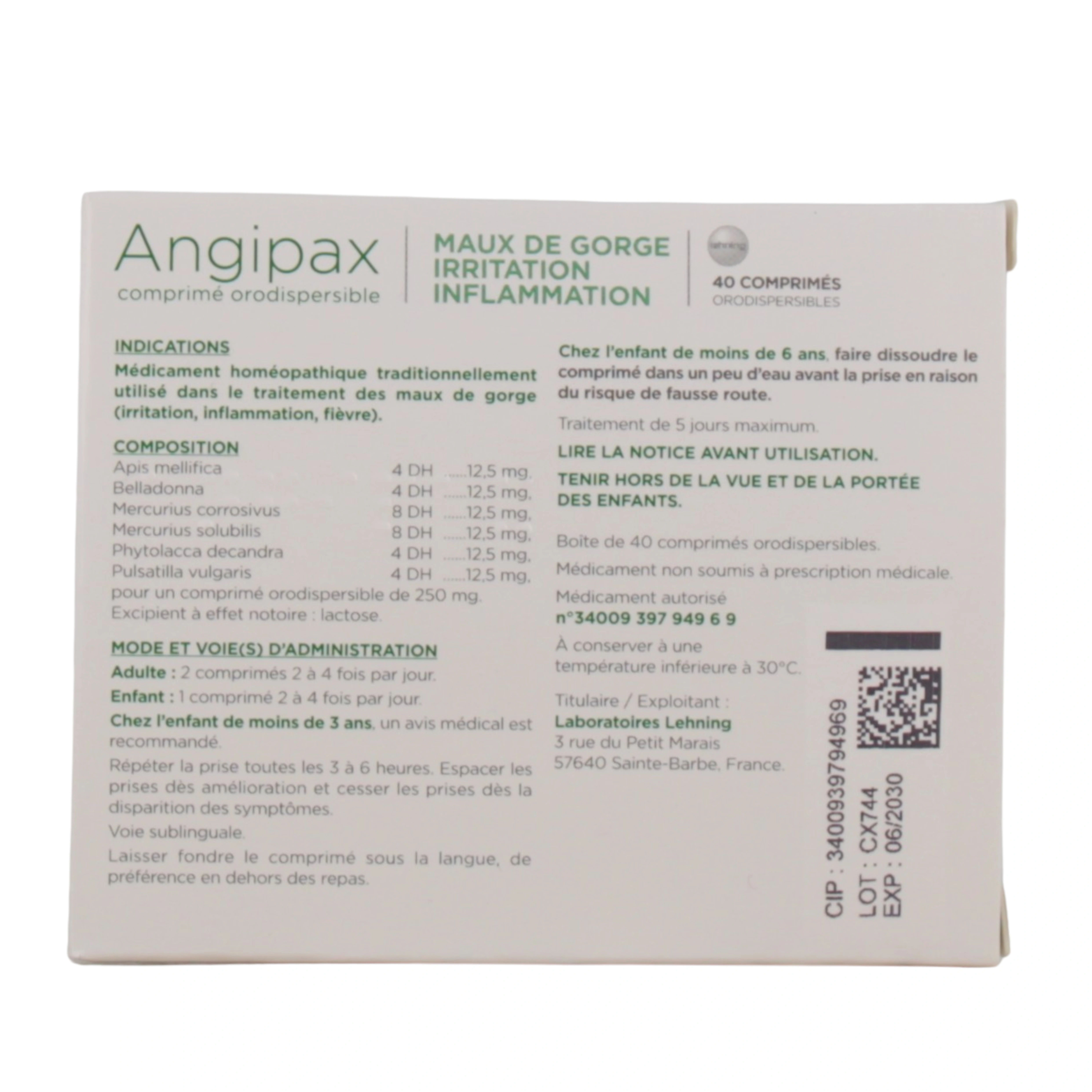 Angipax est un médicament homéopathique des laboratoires Lehning indiqué en cas de maux de gorge, d'irritation et d'inflammation, notamment en cas d'angine non bactérienne.