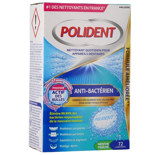 Conditionnement proposé par votre pharmacie en ligne pour le nettoyant antibactérien Polident : boîte de 72 comprimés.