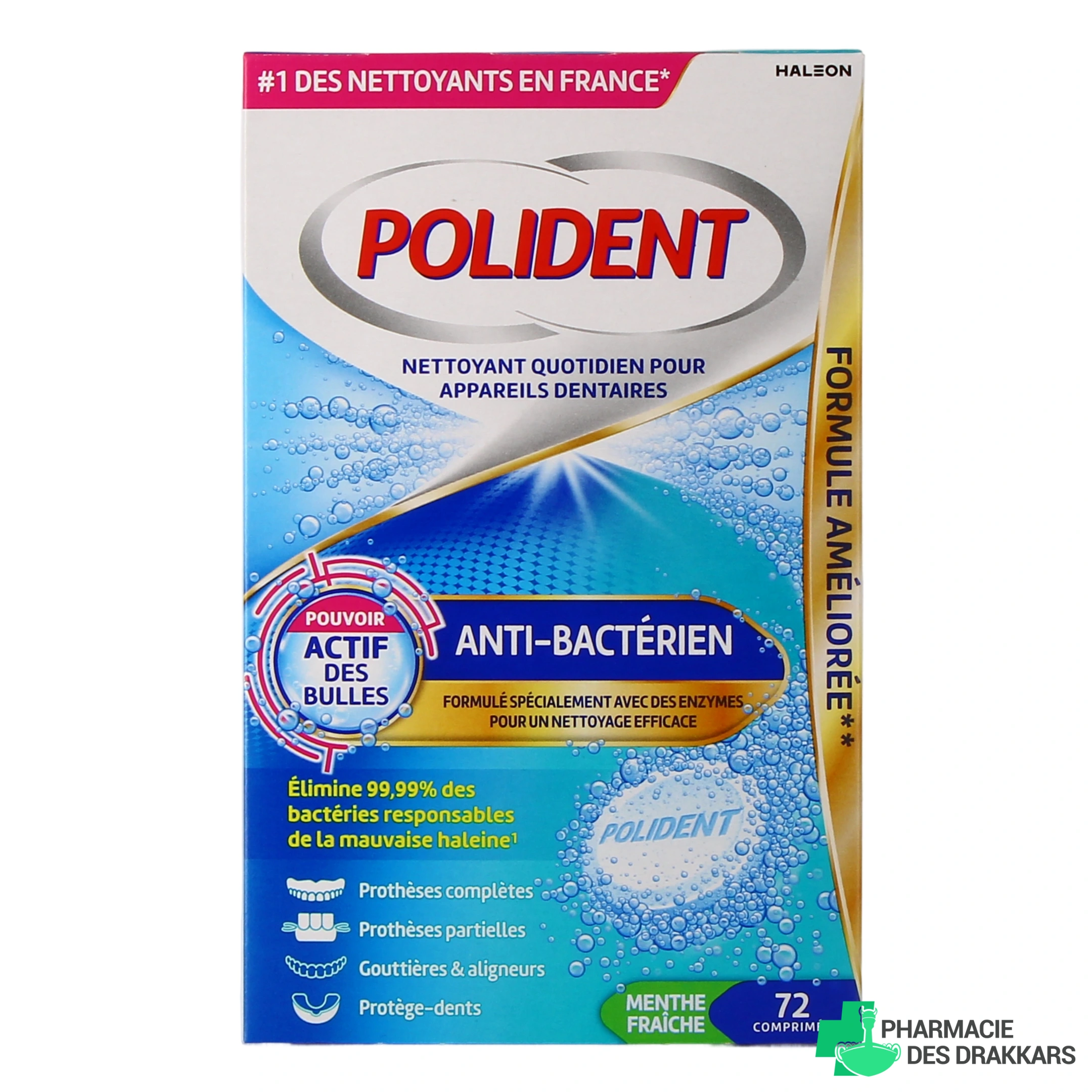 Pour une hygiène bucco-dentaire optimale, l'entretien de votre appareil ou de votre prothèse est essentiel : les bactéries qui se forment sont généralement à l'origine de mauvaises odeurs responsables de la mauvaise haleine. Par ailleurs, une négligence en termes de nettoyage de votre prothèse est susceptible de nuire à vos dents restantes ainsi qu'à vos gencives. Pour ne pas risquer des problèmes de santé, la Pharmacie des Drakkars vous propose alors les comprimés effervescents Polident des Laboratoires GSK.