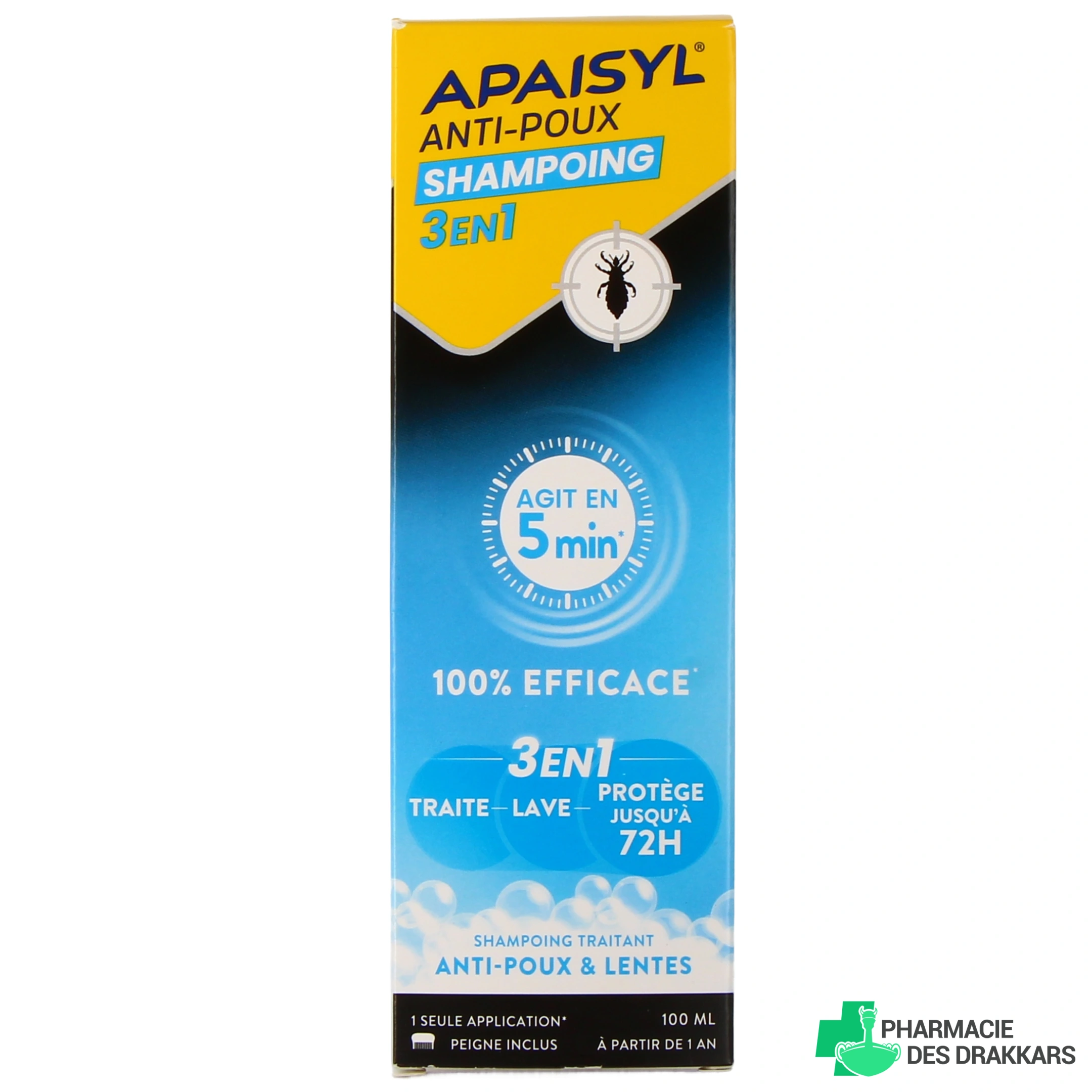 Le shampoing 3-en-1 Apaisyl Anti-Poux est une solution complète qui traite, lave et protège efficacement contre les poux et les lentes. Grâce à son action mécanique, il élimine 100% des poux en seulement 5 minutes sans insecticides chimiques. Sa formule protège également contre les réinfestations pendant 72 heures. Adapté à toute la famille, il peut être utilisé dès l'âge d'un an.