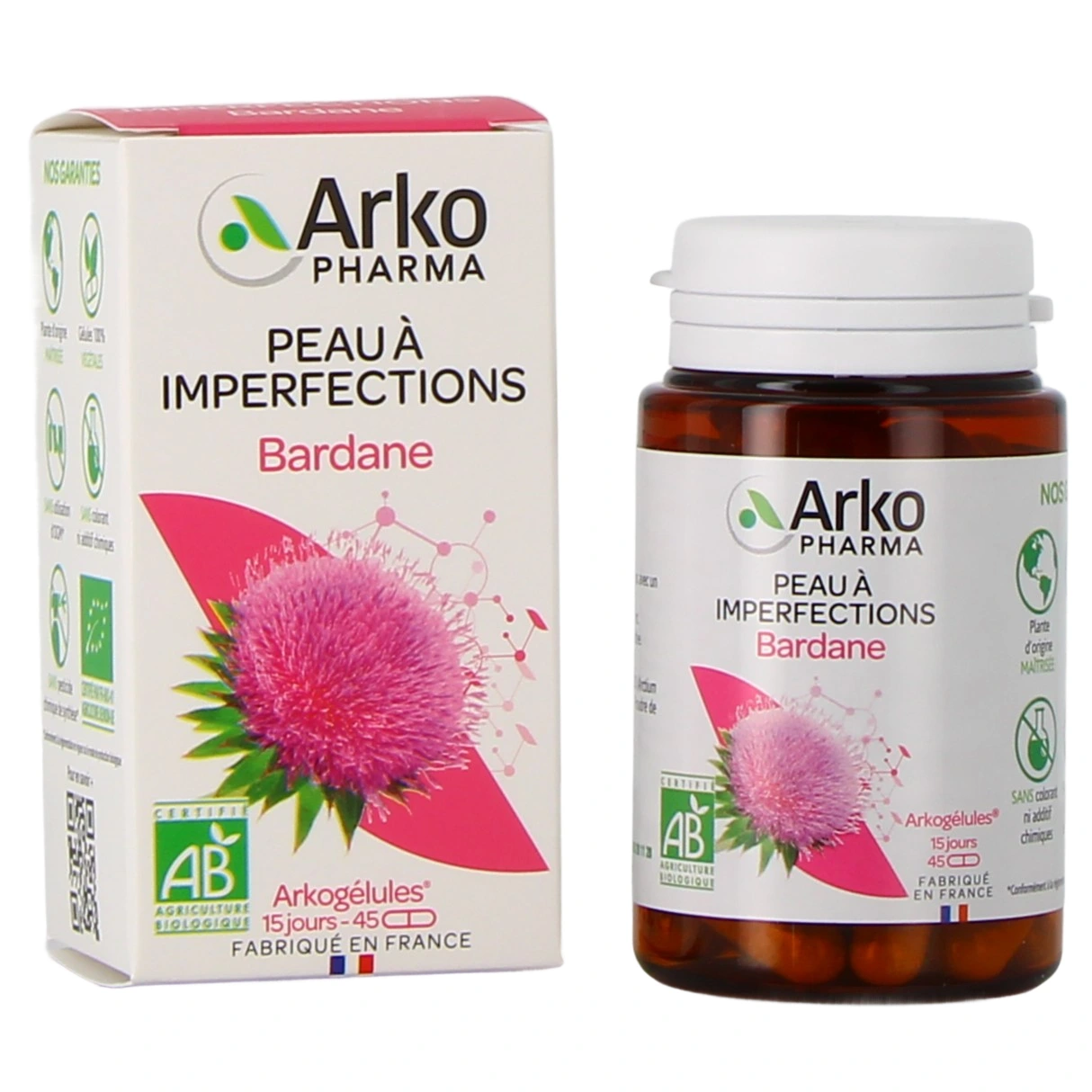 Les Arkogélules Bardane ont été formulées avec le totum intégral de la plante, ce savoir-faire unique permettant de restituer l'intégralité des substances actives qui se trouvent dans ce végétal et qui agissent en synergie. Dans leur version Bio, ces gélules végétales ont été formulées avec de la Bardane d'origine biologique, dont la production est garantie sans utilisation d'OGM, de colorant, d'additif chimique ou encore de pesticide chimique de synthèse.