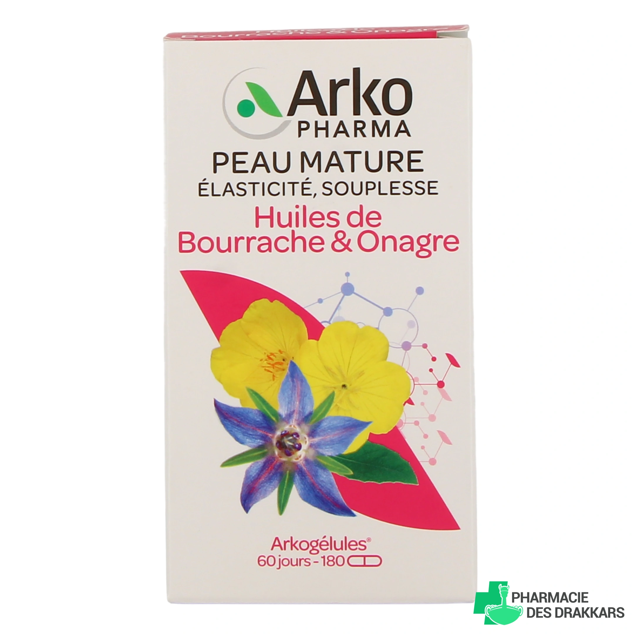 Arkogélules Bourrache & Onagre est un complément alimentaire développé par les laboratoires Arkopharma. Comme son nom l'indique, il est formulé avec des huiles de bourrache et onagre, des ingrédients qui participent à la souplesse de la peau.