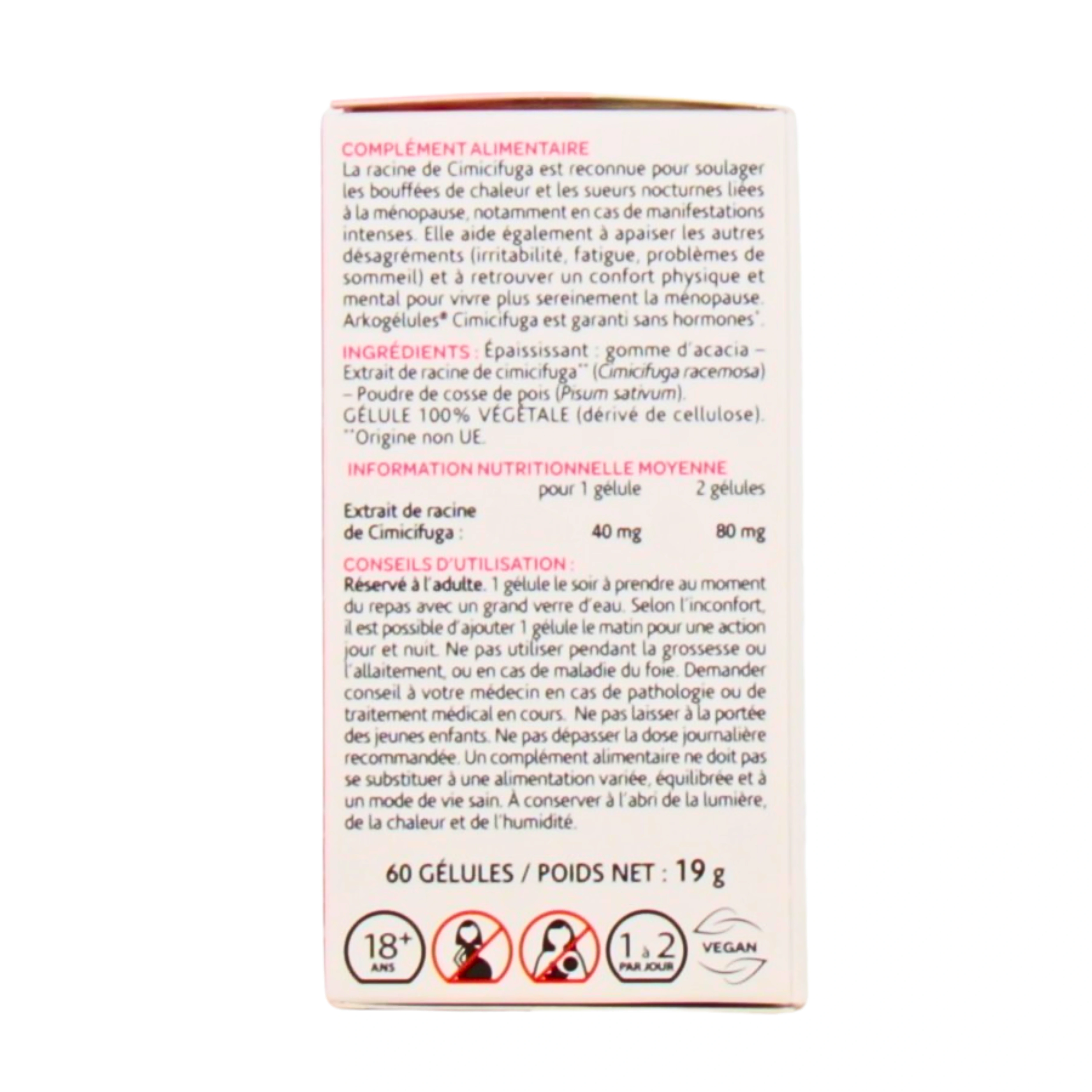 Le complément alimentaire Arkogélules Cimicifuga possède une formule végan. Son utilisation est réservée aux femmes de plus de 18 ans, et est contre-indiquée au cours de la grossesse ou de l'allaitement.