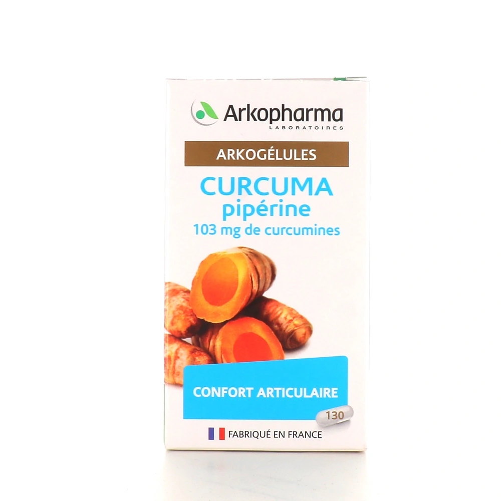 Arkogélules Curcuma Pipérine d'Arkopharma est formulé pour aider à maintenir une flexibilité articulaire et favoriser le bien-être des articulations. Ces gélules de curcuma vous apportent chaque jour 103 mg de curcumine, le pigment principal du curcuma qui lui confère ces bénéfices sur les articulations.