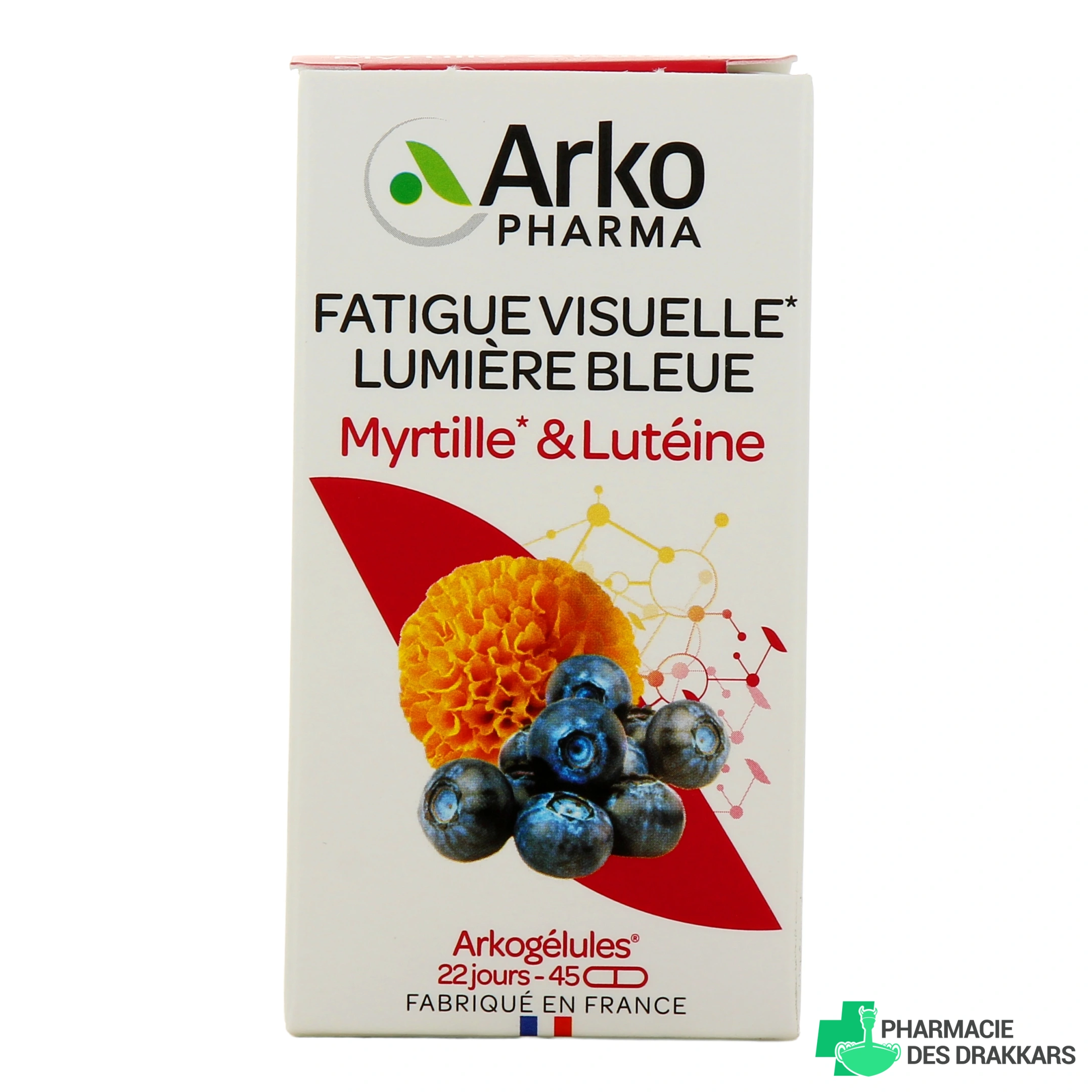 Arkogélules fatigue visuelle lumière bleue est un complément alimentaire Arkopharma à base de Myrtille et de lutéine issue de Rose d'inde, qui aide à réduire la fatigue visuelle et à maintenir les yeux en bonne santé.