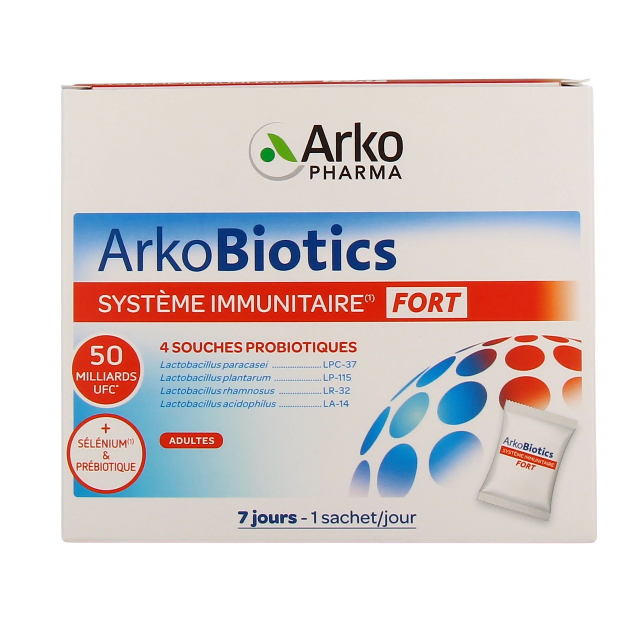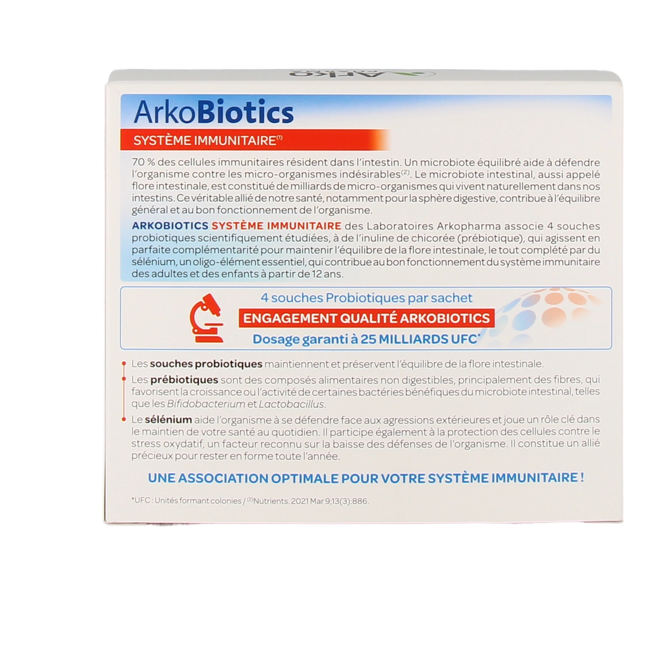 ArkoBiotics Système Immunitaire des laboratoires Arkopharma est un complément alimentaire à base de 4 souches probiotiques, d'inuline de chicorée (prébiotique) et de sélénium pour le système immunitaire. Il se présente sous la forme de sachet à diluer et se décline en une version standard et en une version plus fortement dosée.