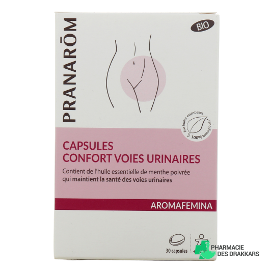 Aromafemina Capsules Confort Voies Urinaires est un complément alimentaire produit par Pranarom qui contient notamment des huiles essentielles qui participent au confort des voies urinaires.