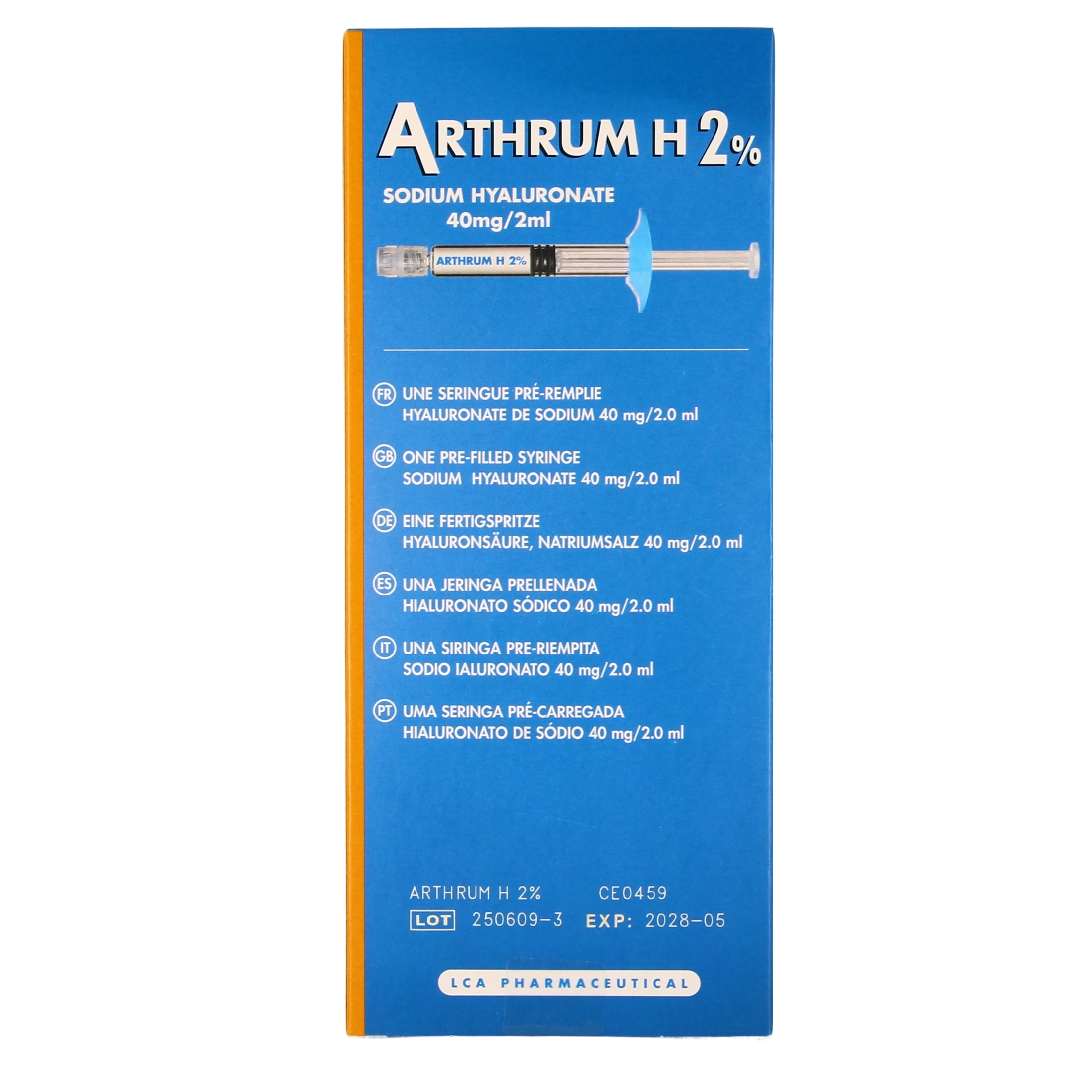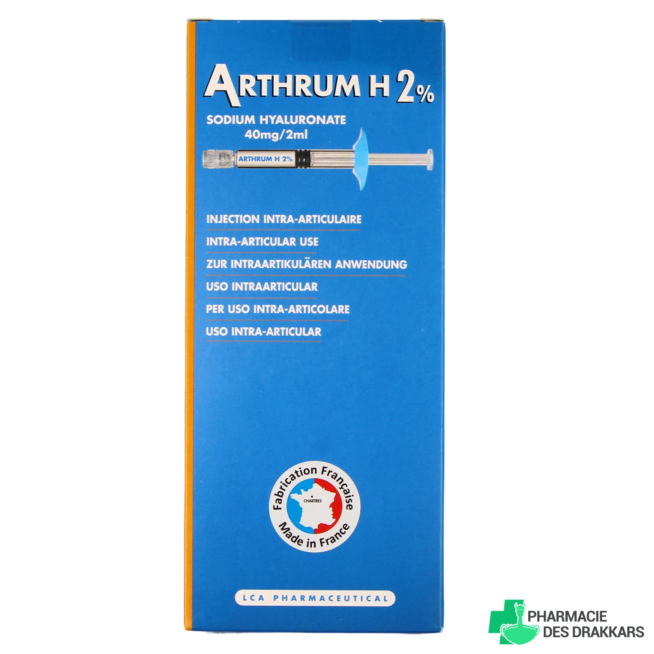 Arthrum H 2% est un dispositif médical sous forme de 3 seringues pré-remplies contenant chacune 40 mg de Hyaluronate de sodium (FB).
