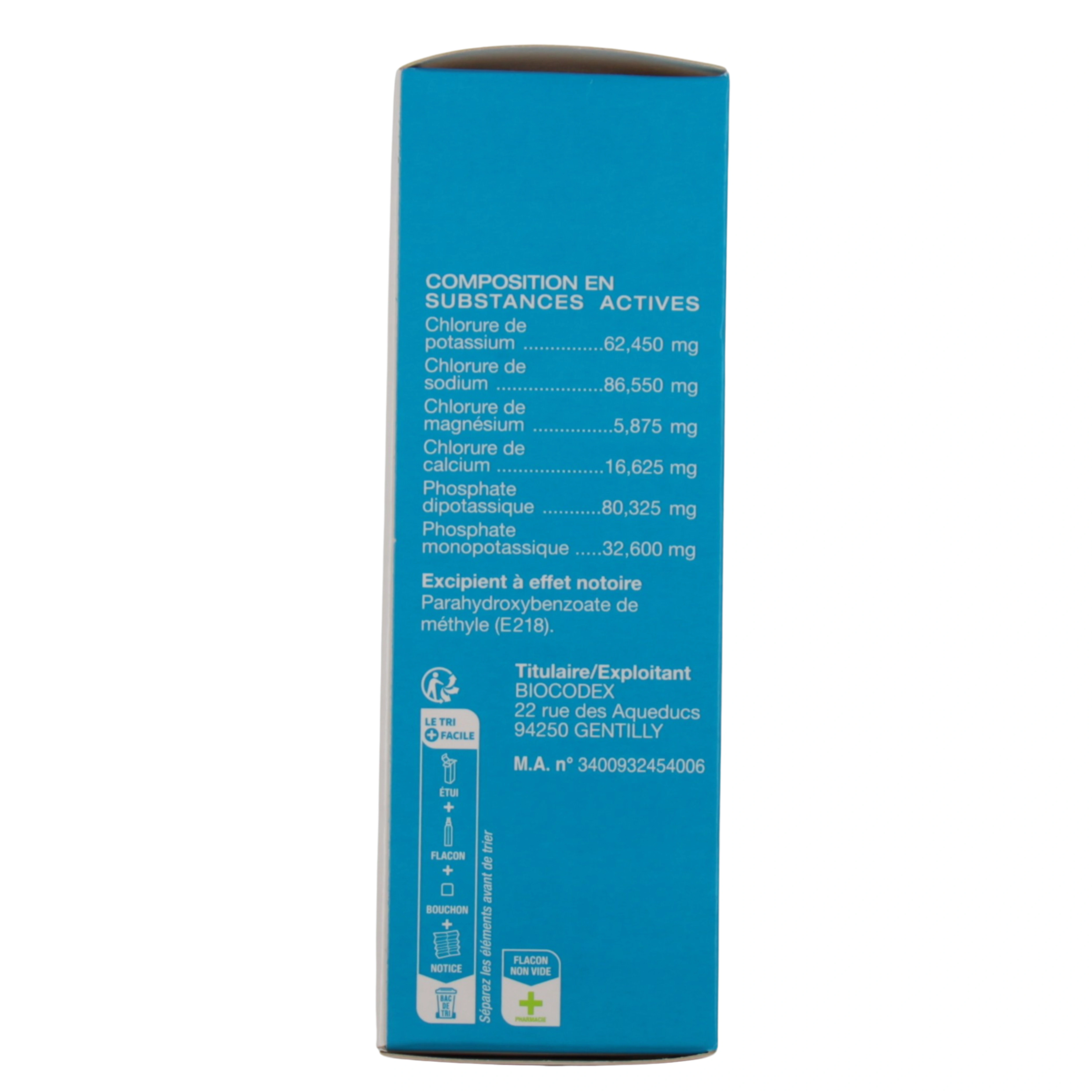 Les substances actives de ce médicament sont les suivantes : le chlorure de potassium (6,2450 mg), le chlorure de sodium (8,6550 mg), le chlorure de magnésium (0,5875 mg), le chlorure de calcium (1,6625 mg), le phosphate dipotassique (8,0325 mg) ainsi que le phosphate monopotassique (3,2600 mg).