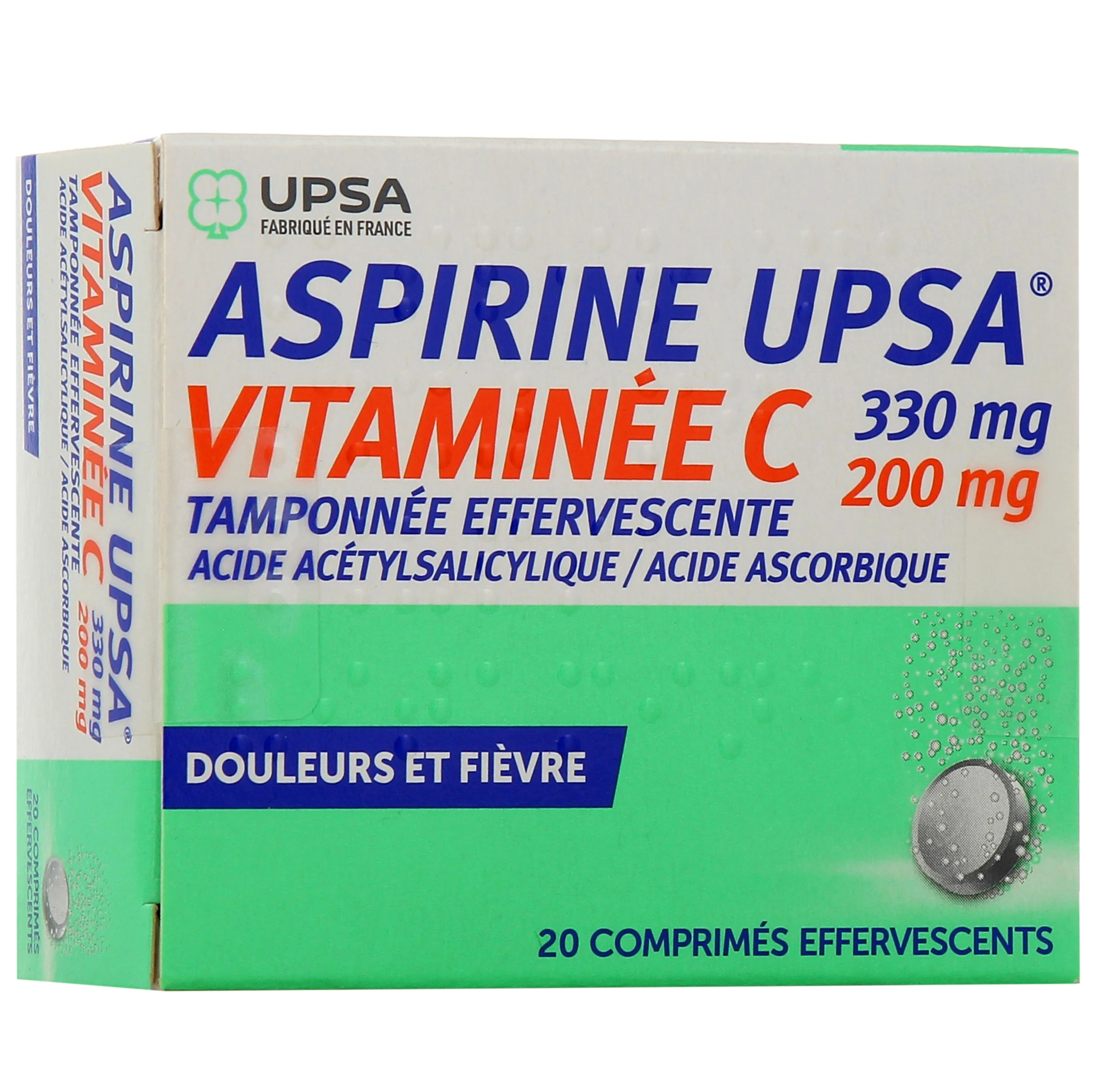 Aspirine Vitaminée C UPSA contient de l'aspirine, un antalgique et antipyrétique et de la vitamine C. Aspirine Vitaminée C UPSA permet de calmer les douleurs, courbatures, de faire baisser la fièvre tout en libérant de la vitamine C pour lutter contre la fatigue.