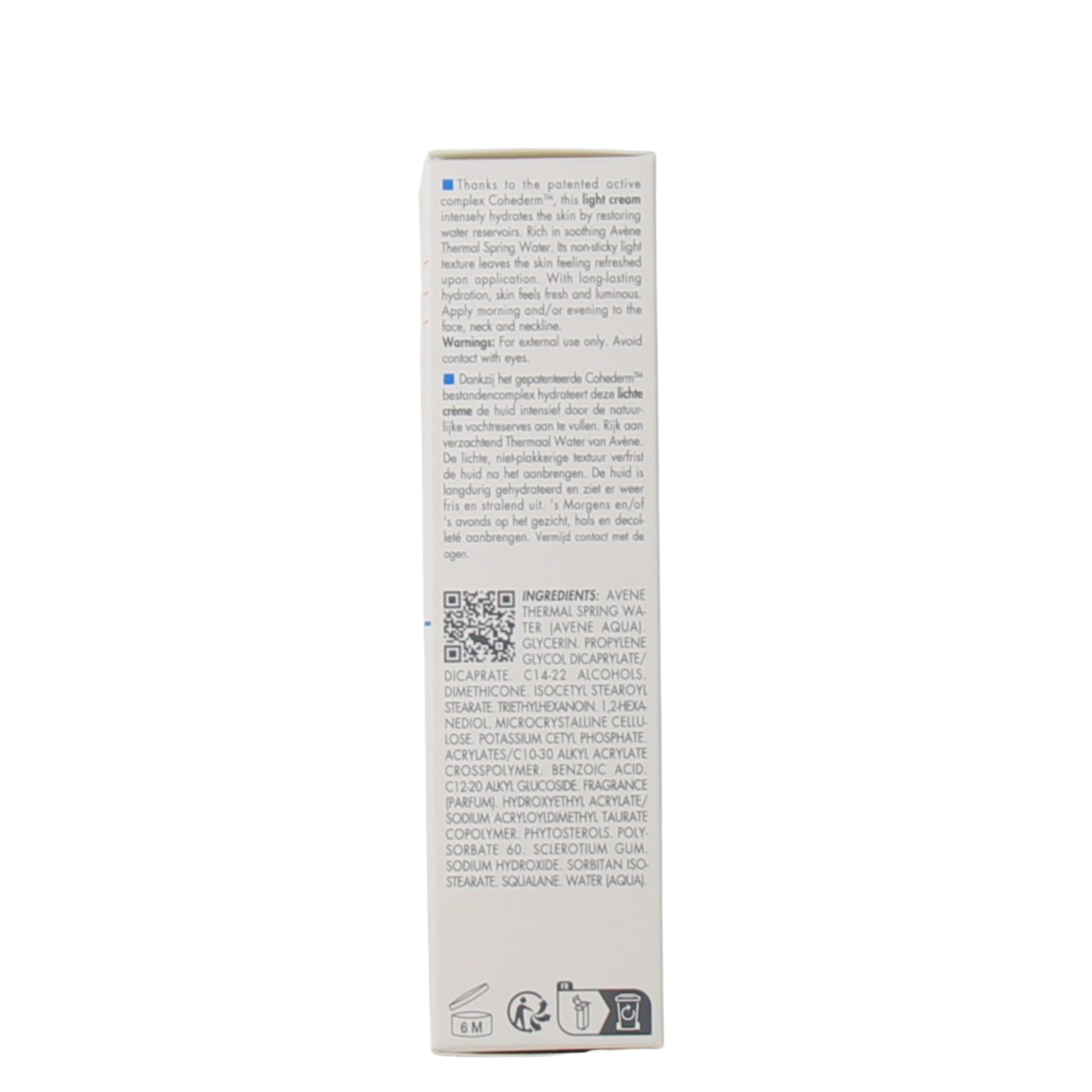 Crème légère : AVENE THERMAL SPRING WATER (AVENE AQUA). GLYCERIN. PROPYLENE GLYCOL DICAPRYLATE/DICAPRATE. C14-22 ALCOHOLS. DIMETHICONE. ISOCETYL STEAROYL STEARATE. TRIETHYLHEXANOIN. 1,2-HEXANEDIOL. MICROCRYSTALLINE CELLULOSE. POTASSIUM CETYL PHOSPHATE. ACRYLATES/C10-30 ALKYL ACRYLATE CROSSPOLYMER. BENZOIC ACID. C12-20 ALKYL GLUCOSIDE. FRAGRANCE (PARFUM). HYDROXYETHYL ACRYLATE/SODIUM ACRYLOYLDIMETHYL TAURATE COPOLYMER. PHYTOSTEROLS. POLYSORBATE 60. SCLEROTIUM GUM. SODIUM HYDROXIDE. SORBITAN ISOSTEARATE. SQUALANE. WATER (AQUA).