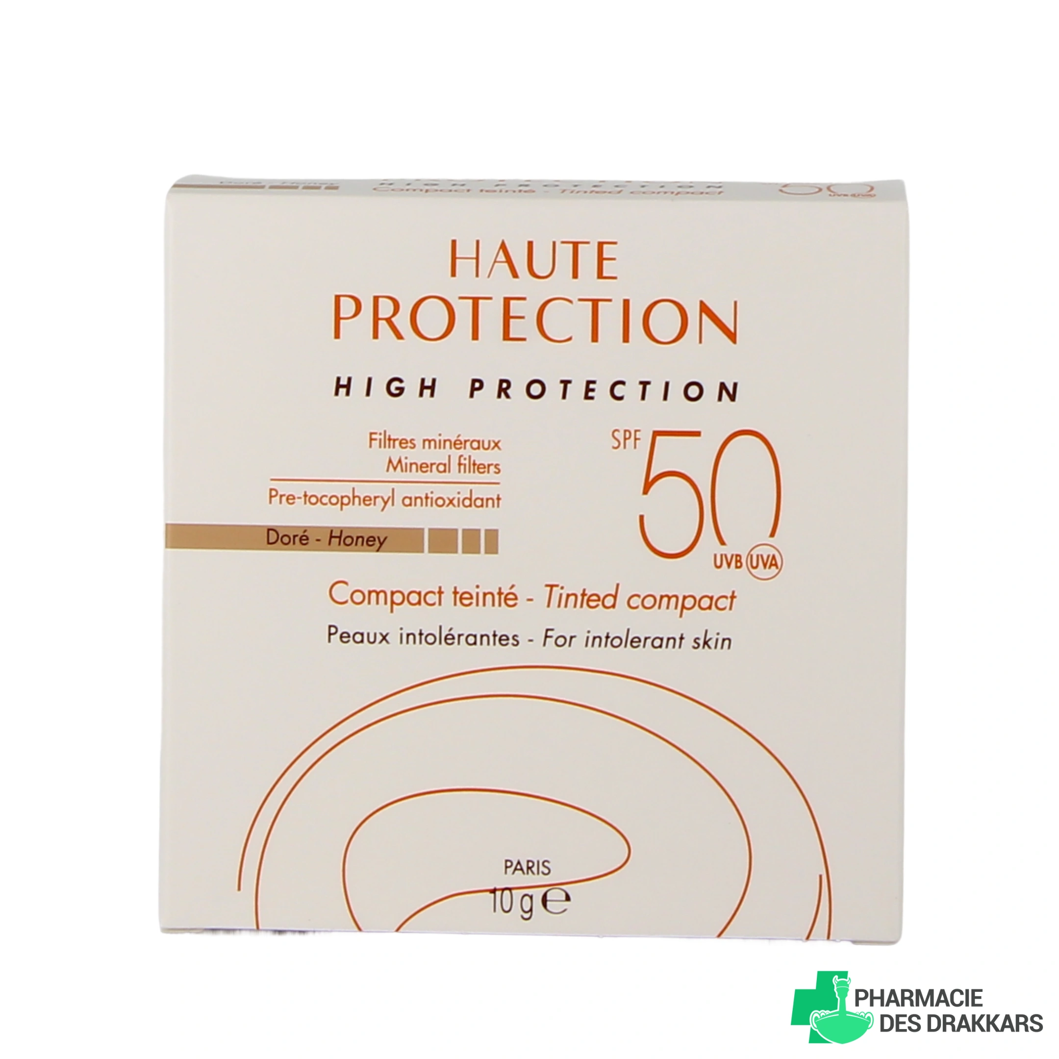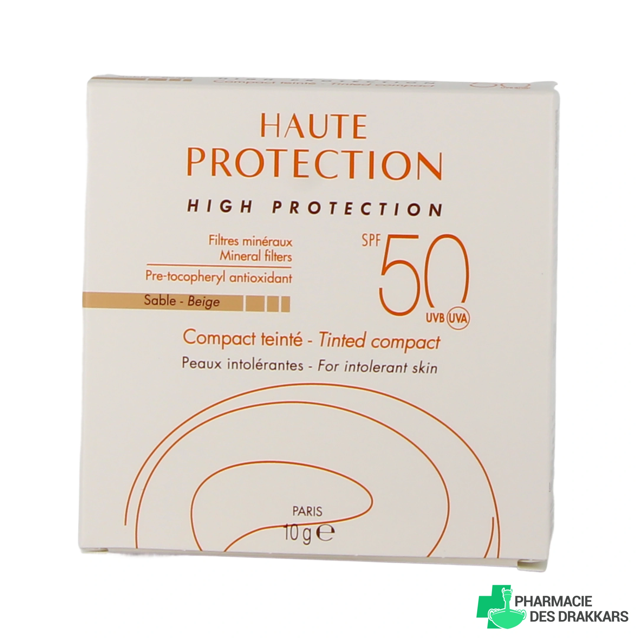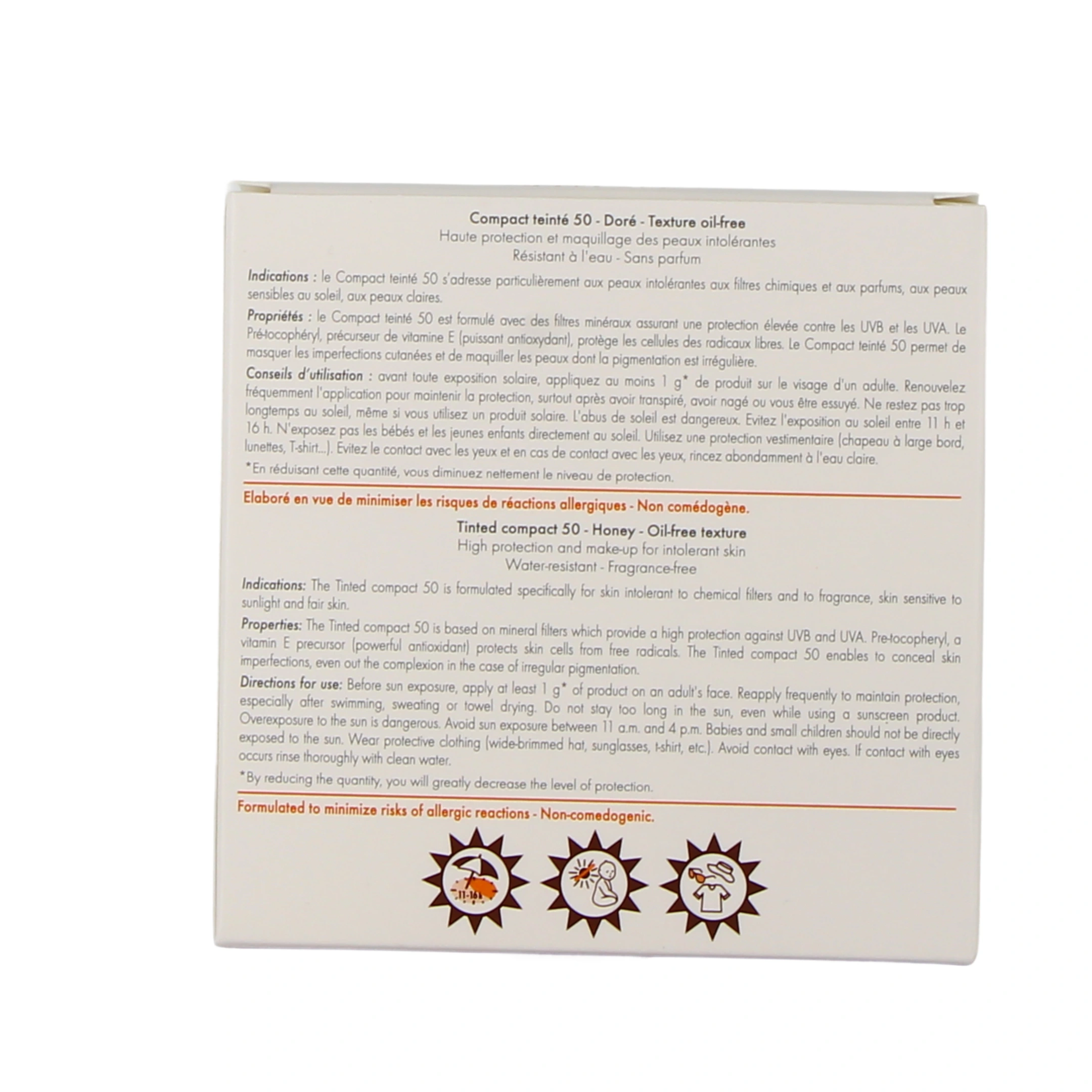 Avène Solaire Compact Teinté SPF50+ est une crème solaire compacte teintée haute protection, pour les peaux intolérantes au soleil grâce à sa formule haute tolérance, avec un système solaire filtrant photo-protecteur anti UVA/UVB d'indice global SPF 50+.