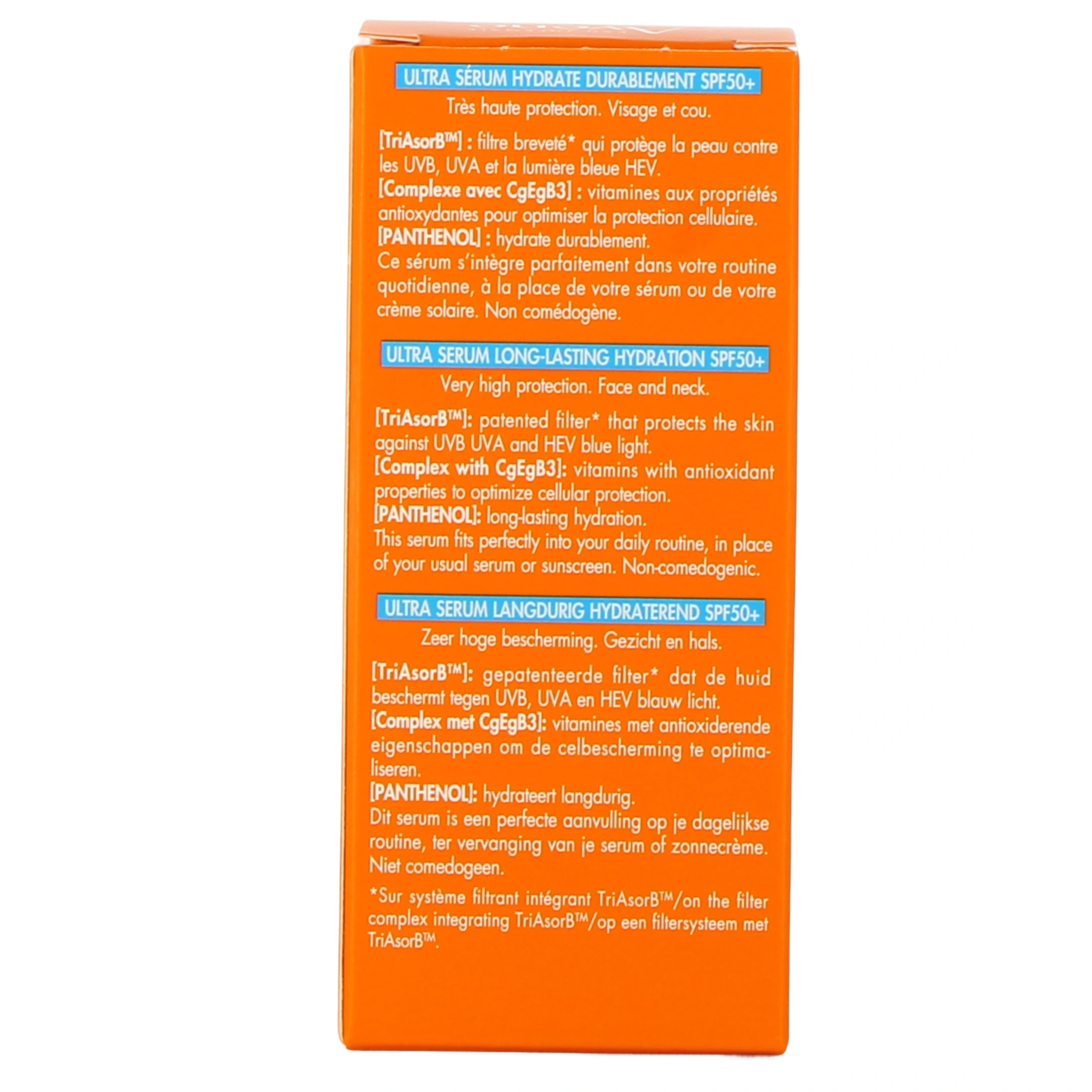 Véritable innovation, l'ultra sérum hydratant SPF 50+ Avène combine la très haute protection d'une crème solaire et l'hydratation d'un soin. Adapté à toutes les peaux, même sensibles, ce sérum intègre le système de filtration anti UVA et UVB Triasorb™ breveté, ainsi qu'un complexe de vitamines, accompagné de 1% de panthénol pour protéger durablement et sublimer visiblement la peau. Il convient à tous et peut être utilisé toute l'année.