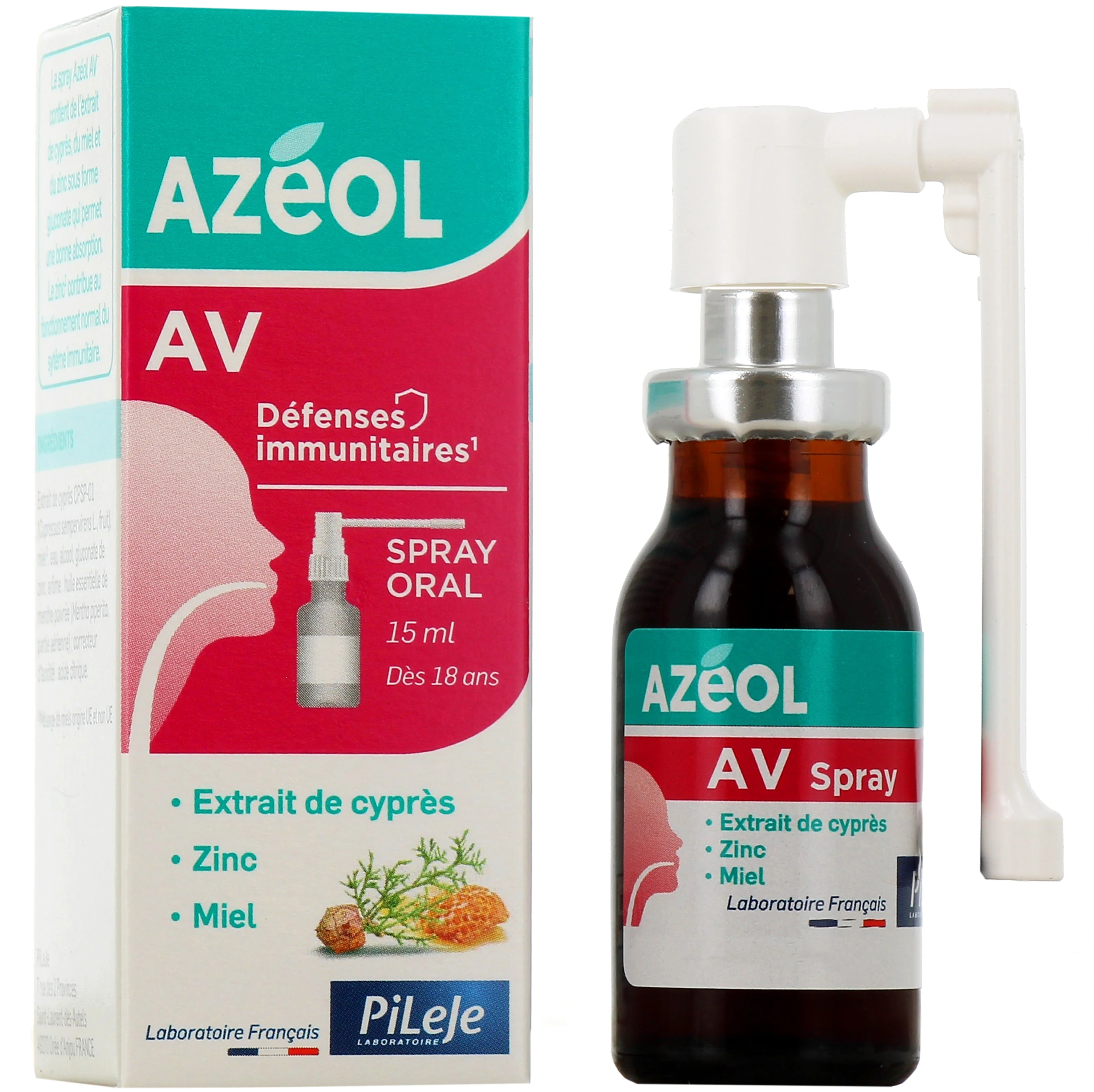 Le spray Azeol AV est un complément alimentaire du laboratoire Pileje à base d'extrait de cyprès et de zinc. Il est indiqué pour les défenses immunitaires.