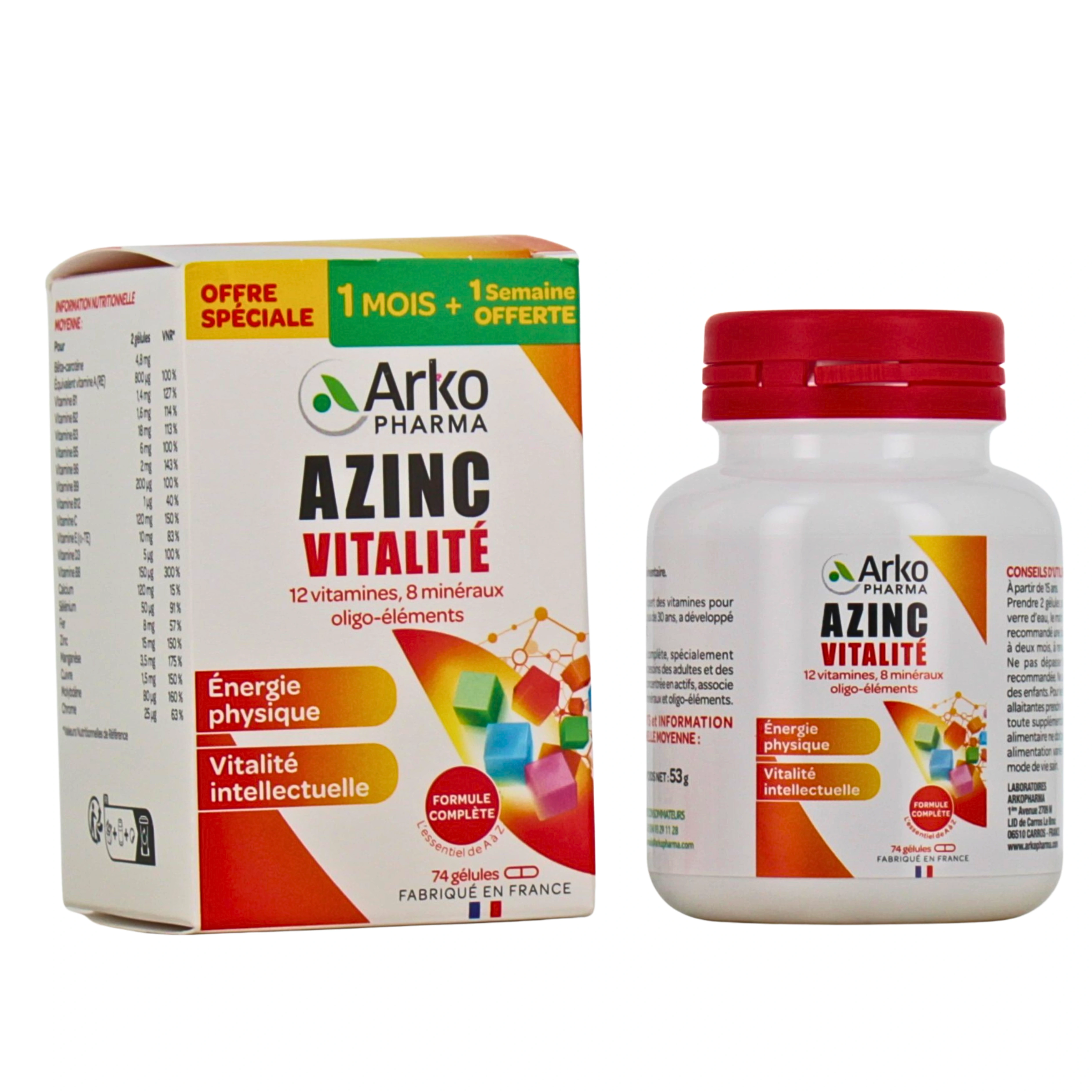 Azinc Vitalité d'Arkopharma est un complément alimentaire riche en vitamines et oligo-éléments. Il contient des minéraux tels que le magnésium, le zinc, le calcium, le cuivre et le chrome, ainsi que du carbonate de sodium. Ces éléments sont essentiels à l'organisme pour maintenir un bon état de santé général et pour aider à combattre la fatigue :