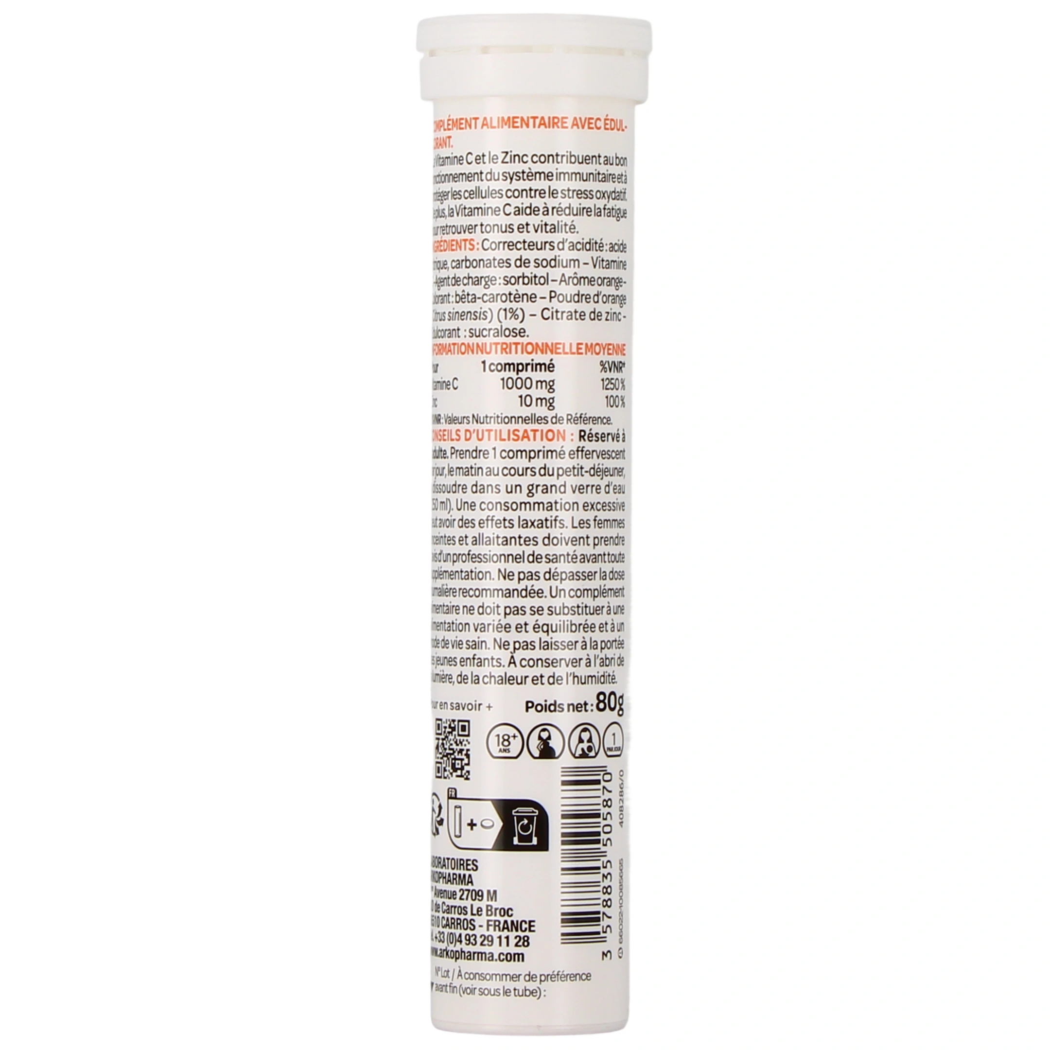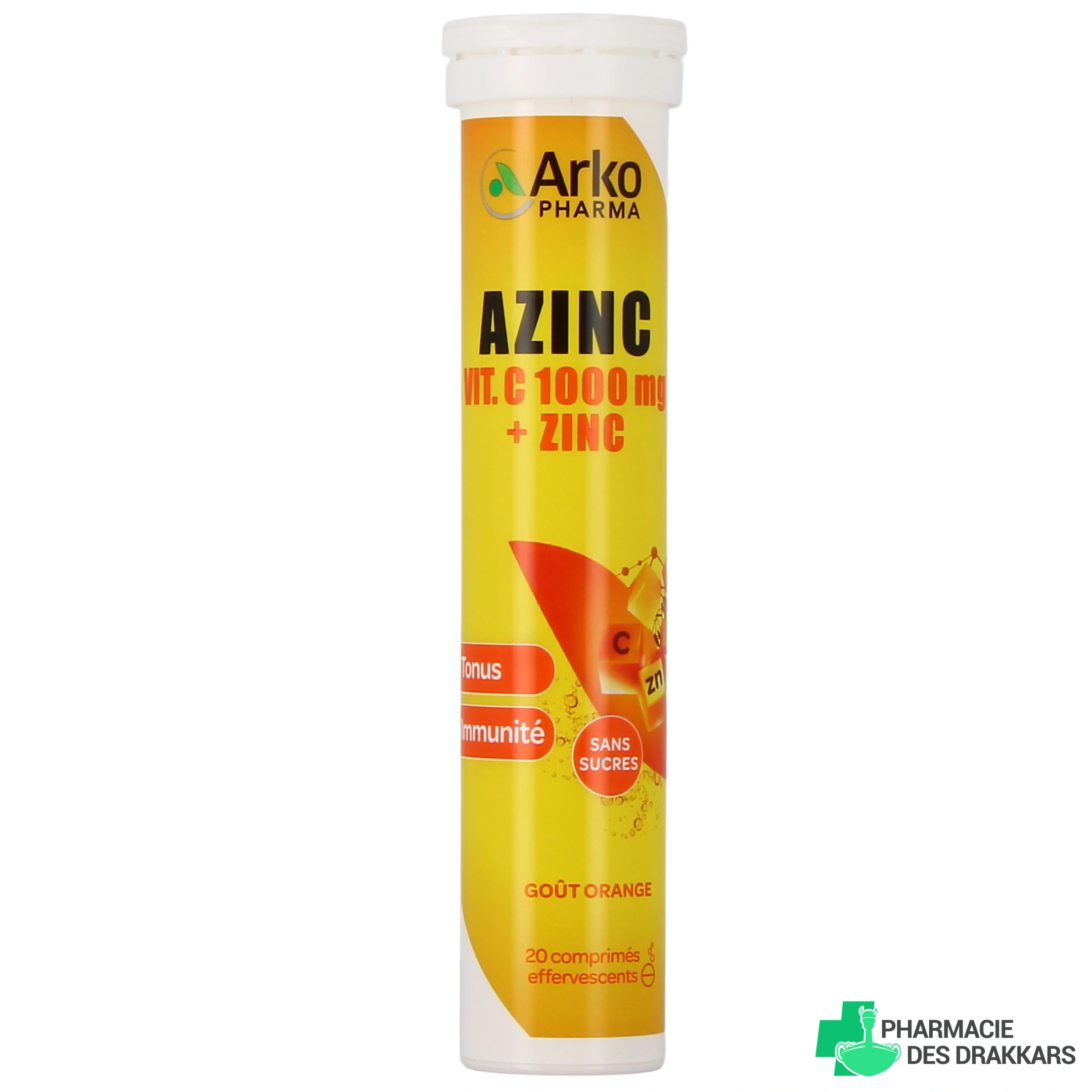 Vous pourrez sélectionner le complément alimentaire Azinc Vitamine C 1000 mg + Zinc d'Arkopharma parmi les conditionnements suivants sur notre pharmacie en ligne : tube de 20 comprimés effervescents goût orange.