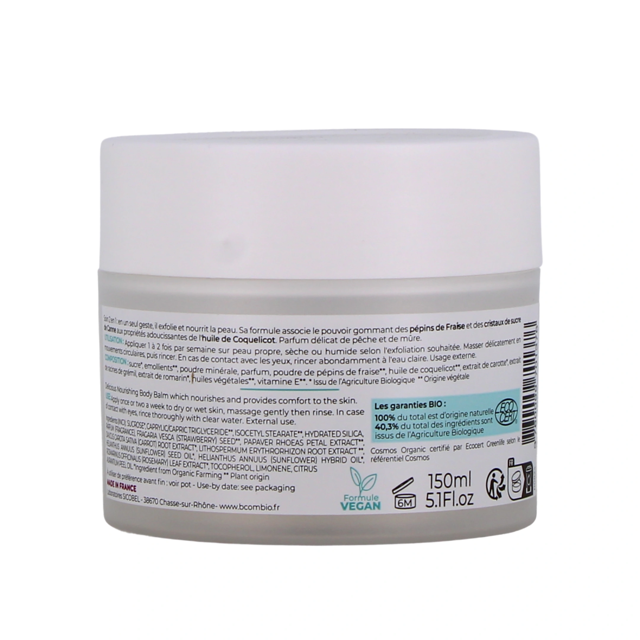 Vous adorerez notamment le parfum gourmand du gommage corps nourrissant B Com Bio et sa texture gourmande façon confiture de fraise, qui vous aident à passer un délicieux moment tout en prenant soin de vous ! Associé à d'autres soins du corps de la gamme B Com Bio, il permet par ailleurs de renforcer leur efficacité. Grâce au gommage corps nourrissant B Com Bio, débarrassez votre peau de toutes les cellules mortes et les impuretés, et redonnez-lui toute sa douceur !