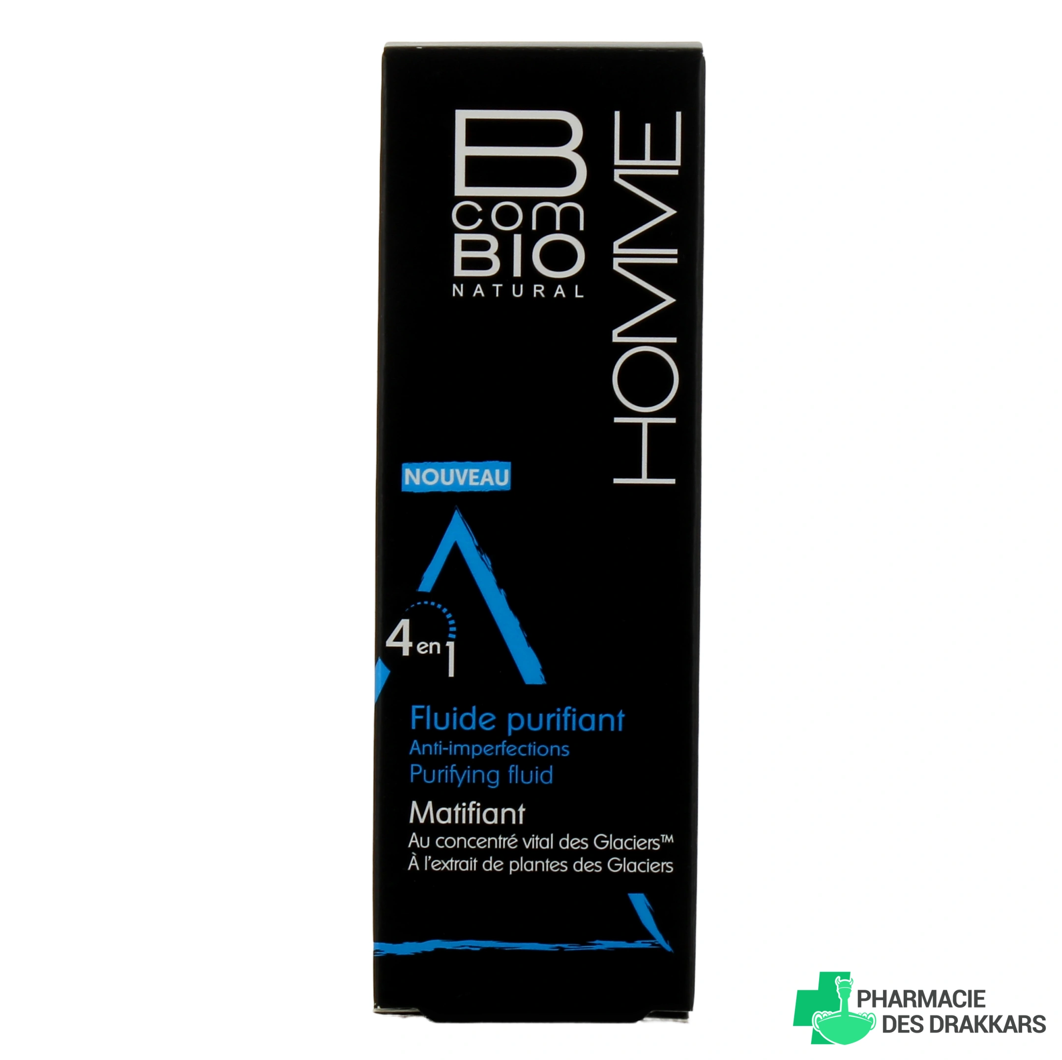 Pour combattre les boutons et les points noirs sur la peau de votre visage, mais aussi réduire l'apparence des marques, ne manquez pas le fluide Purifiant Matifiant Anti-imperfections pour homme de B Com Bio !