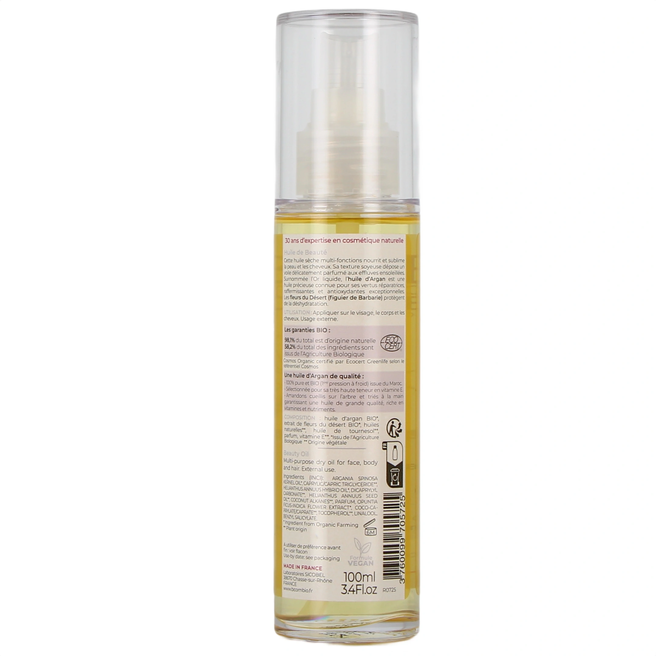 L'huile de beauté B Com Bio s'utilise sur le visage et le corps comme soin hydratant, nourrissant et sublimateur. Elle permet également de nourrir les cheveux pour leur apporter de la souplesse et de la brillance. Cette huile multifonctions contient de l'huile d'Argan 100% pure et Bio pour offrir une action anti-oxydante grâce à sa richesse en vitamine E. L'huile d'argan est un véritable élixir de beauté, notamment grâce à ses propriétés réparatrices et raffermissantes. L'extrait de fleurs du désert (figuier de Barbarie) a été sélectionné pour protéger la peau de la déshydratation.