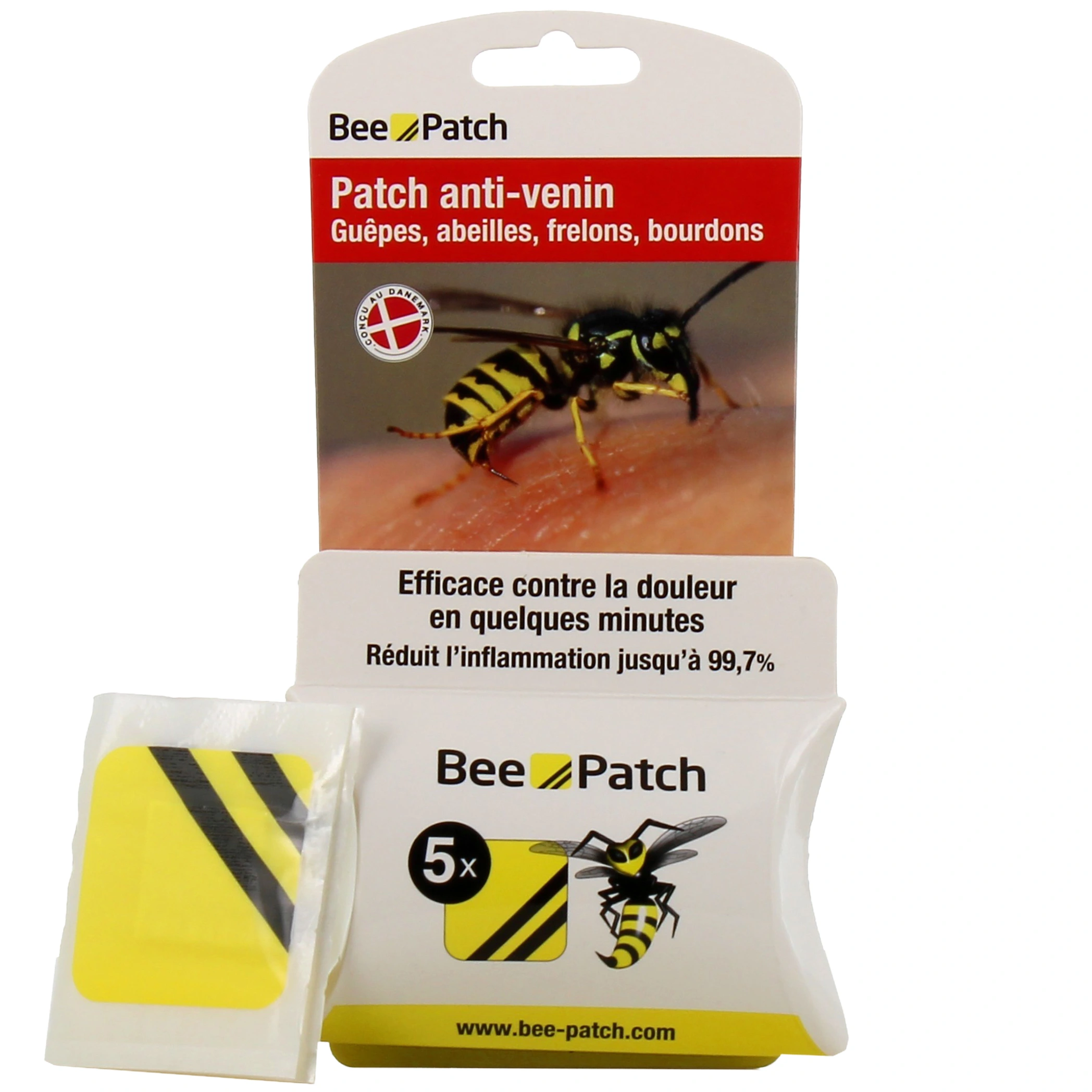 - Apposez sur la piqûre le patch anti-venin Bee Patch comme un pansement dans les 30 minutes qui suivent la blessure