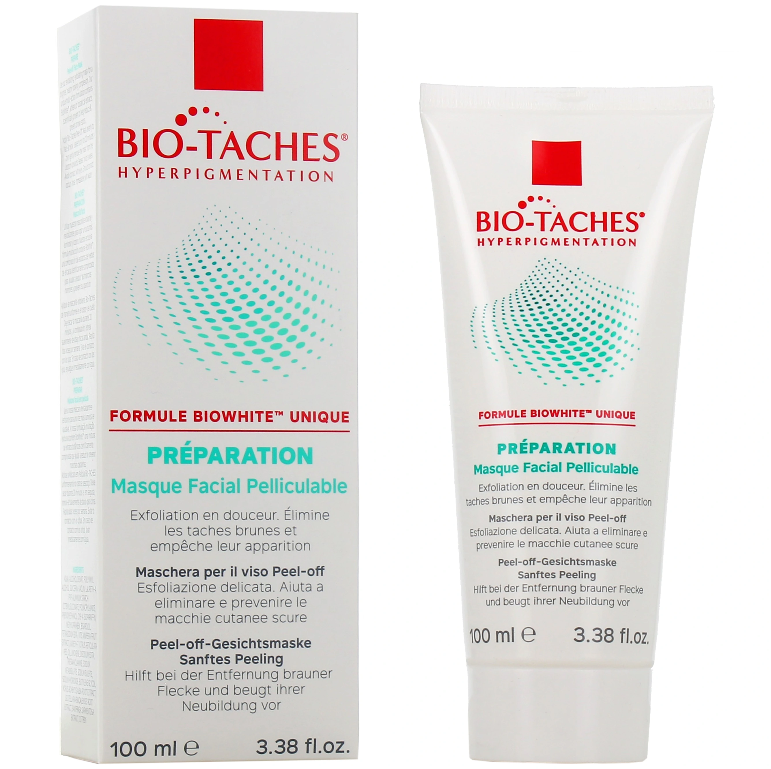 Permettant une exfoliation douce, le masque facial pelliculable Bio-Taches est indiqué en cas d'hyperpigmentation, de taches pigmentaires, mélasma, marques d'acné... Il élimine les taches brunes et prévient leur apparition.