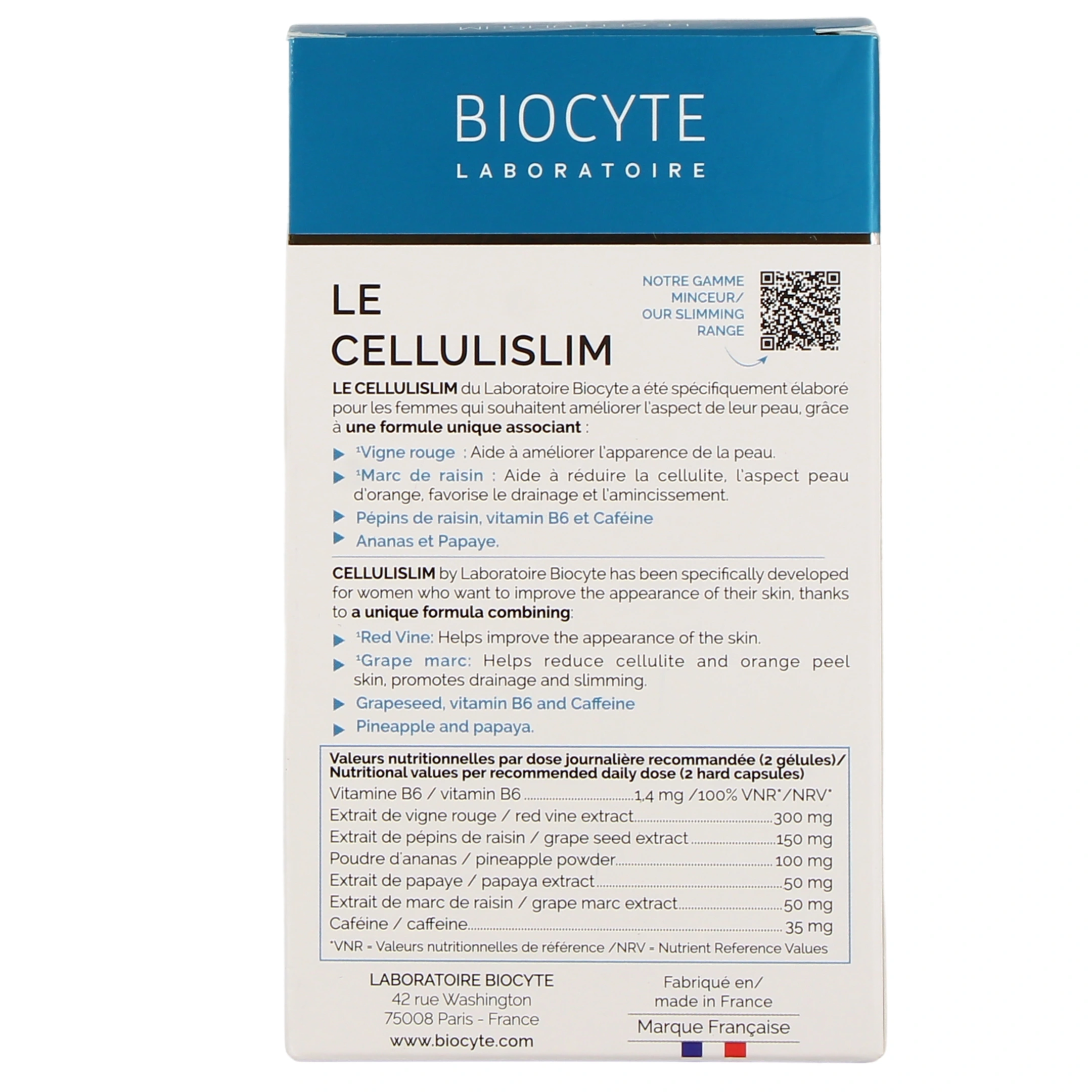 Biocyte Le Cellulislim est un complément alimentaire dont l'usage est exclusivement réservé à l'adulte. Prenez 2 gélules par jour avec un grand verre d'eau. Renouveler de préférence pendant 3 mois. Précautions d'emploi de Biocyte Le Cellulislim Peau d'Orange :- Contient de la caféine (35 mg), déconseillé aux enfants et aux femmes enceintes.