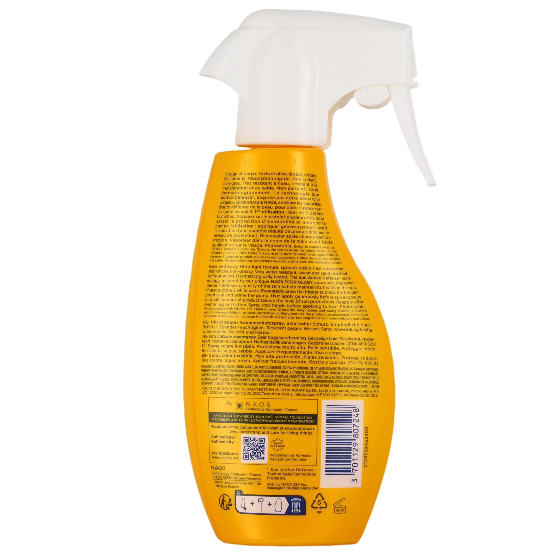 La formule de ce spray solaire s'appuie sur des filtres solaires photostables qui vont empêcher la pénétration des UV dans la peau. On retrouve le brevet Sun Active Defense, présent dans tous les solaires Bioderma, et dont la mission consiste à stimuler les défenses naturelles de la peau face au soleil. La glycérine est associée à des sucres naturels pour maintenir un bon taux d'hydratation et soutenir le confort cutané. L'ectoïne est ajoutée pour ses propriétés anti-inflammatoires. Enfin, la vitamine E et un extrait d'algue assurent le pouvoir antioxydant du produit.