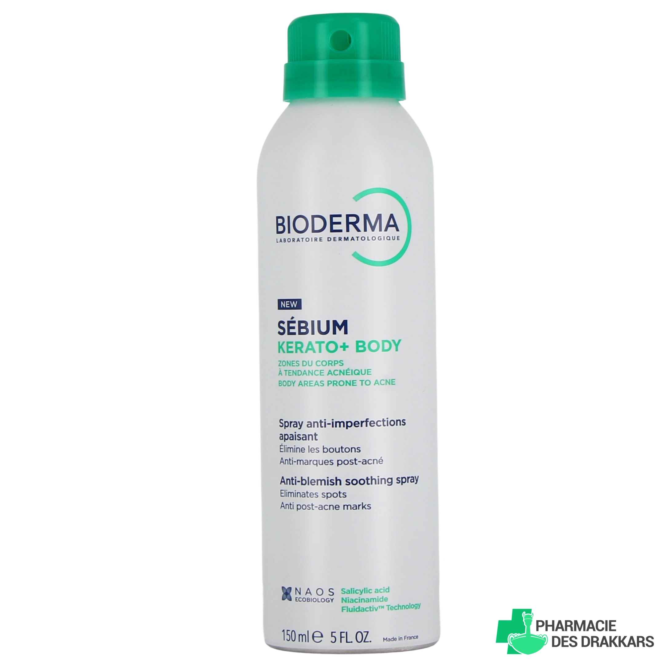 Le spray Kerato+ Body Bioderma repose sur la technologie Fluidactiv™ qui normalise biologiquement la qualité du sébum, essentielle pour prévenir l'apparition de nouveaux boutons. Il contient de l'acide salicylique qui favorise l'élimination des cellules mortes et le renouvellement épidermique ainsi que du niacinamide qui aide à apaiser la peau. Bioderma Sébium Kerato+ Body contient également de la glycérine aux propriétés humectantes et un extrait de lilas, associé à un complexe de sucre, qui agit intensément pour réduire les imperfections et les cicatrices d'acné en limitant l'accumulation de cellules mortes et en régulant la production de sébum.