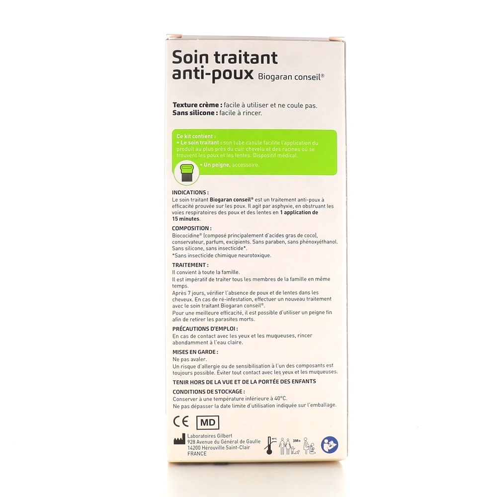 Le soin traitant anti-poux Biogaran présente l'avantage d'être adapté à toute la famille, y compris les bébés à partir de 3 mois et les femmes enceintes et allaitantes. Il se présente dans un tube canule qui permet une application précise du produit au plus près du cuir chevelu et des racines, où s'abritent les poux et les lentes. Un peigne anti-poux est présent dans le kit pour faciliter le retrait des parasites après le rinçage du produit.